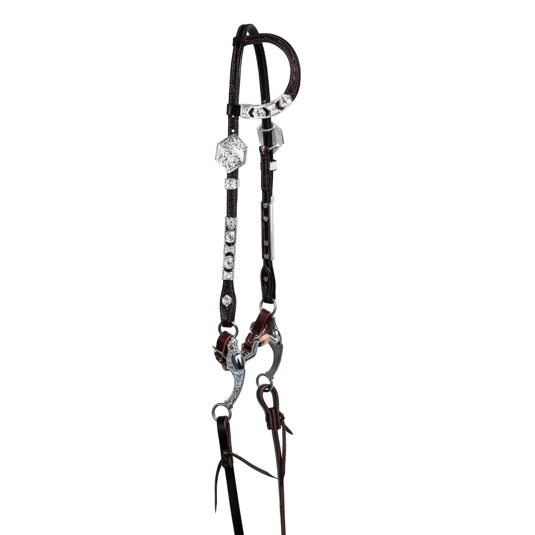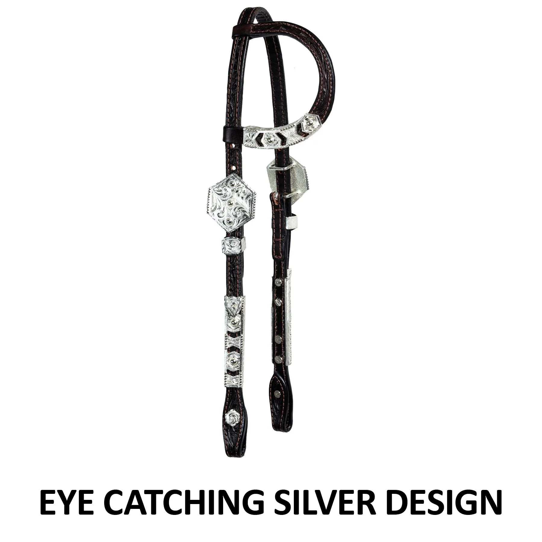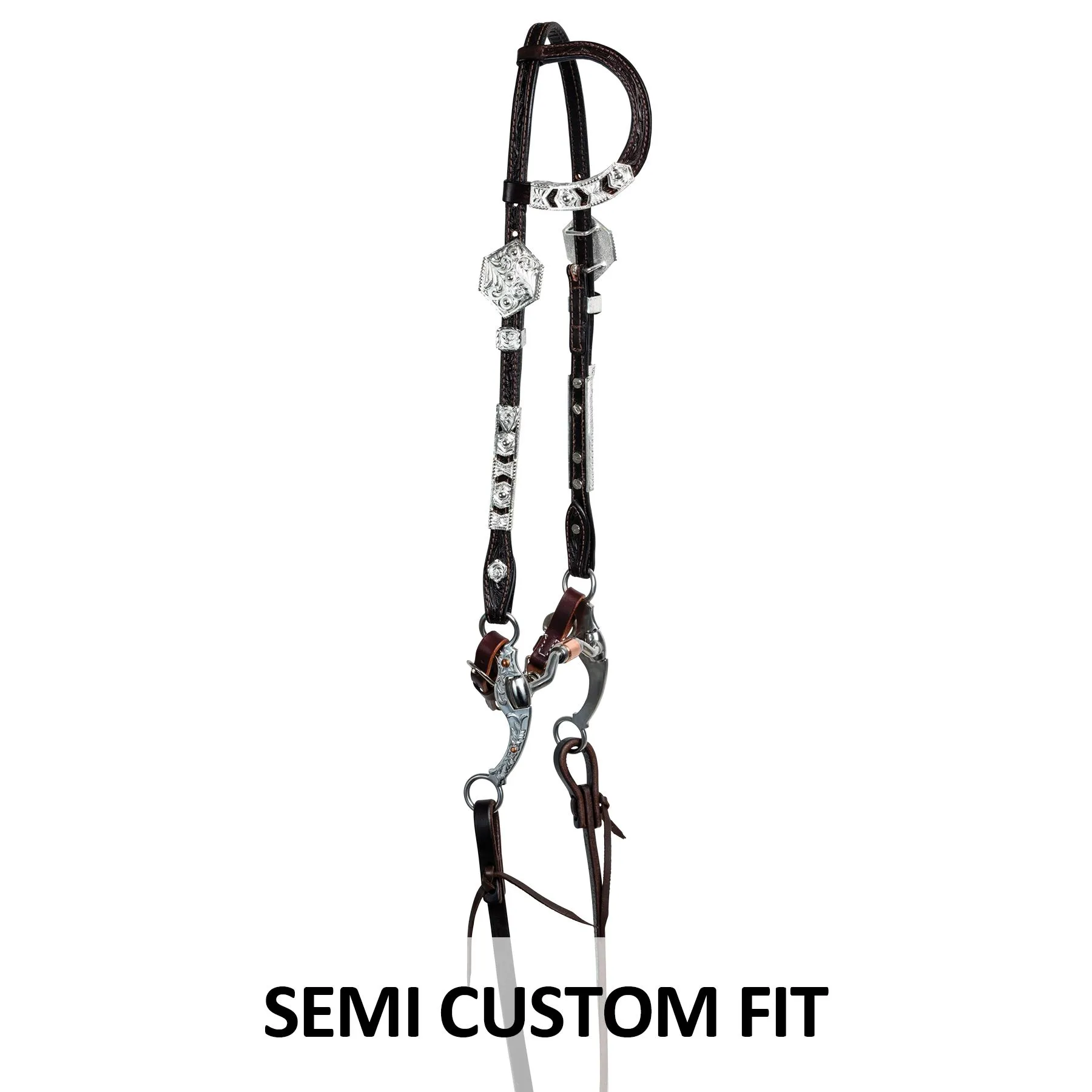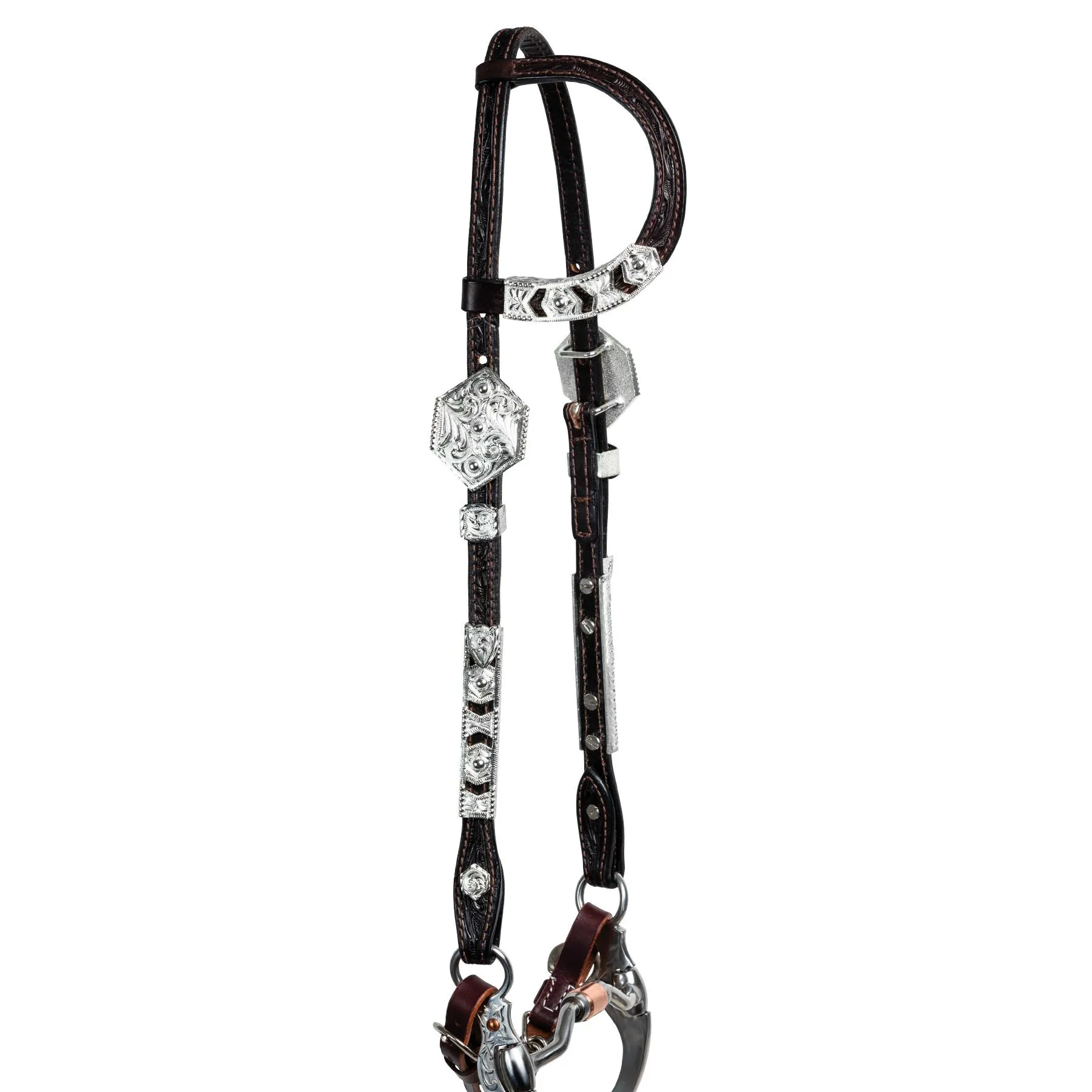 The fun silver cut-out design on this one ear headstall offers you a lower price without losing any show ring appeal. Cast Silver is an excellent alternate to hand tooled silver plate that doesn’t skimp on looks. One ear design with silver trim, buckle sets, and cheek silver. Concho bit end with chicago screws.