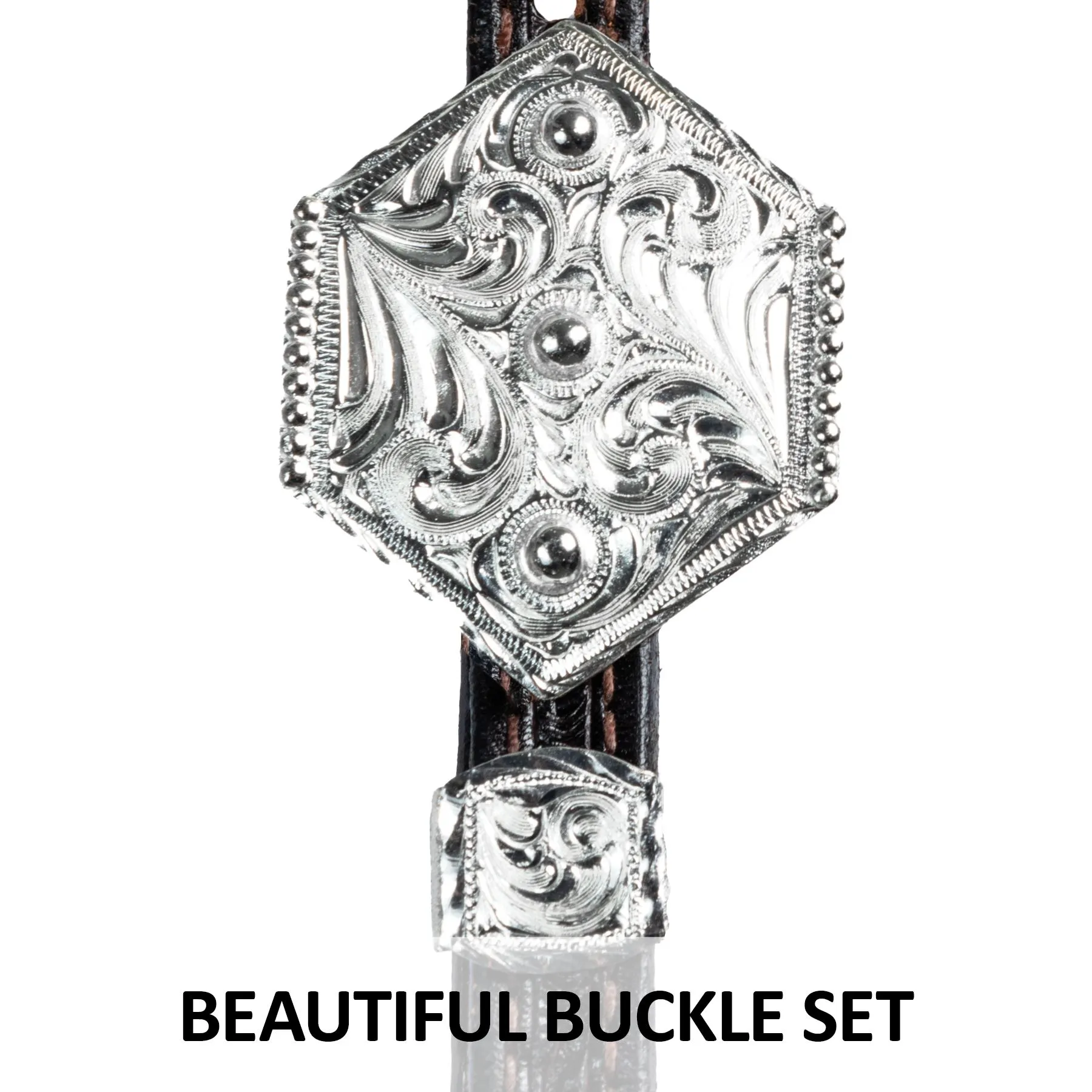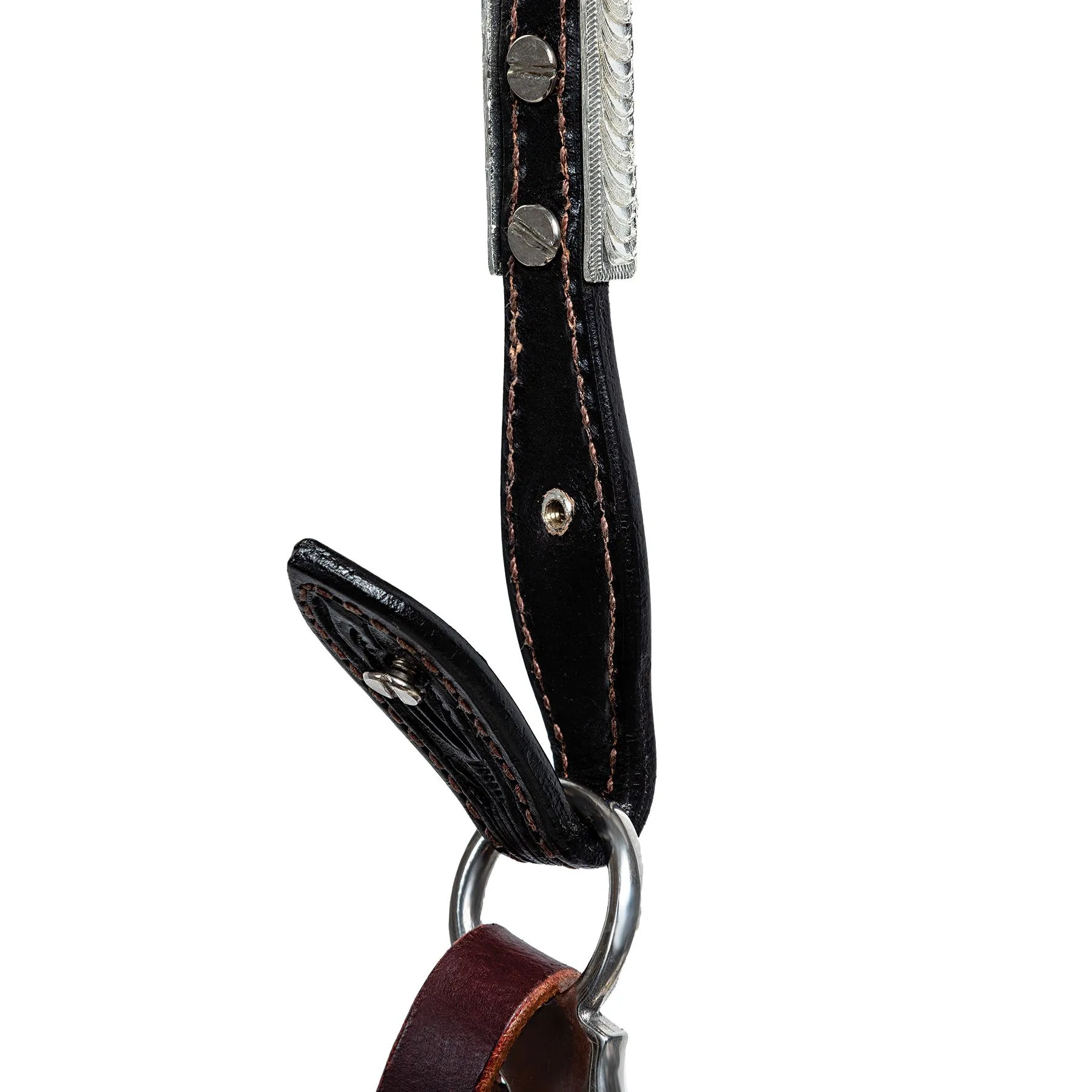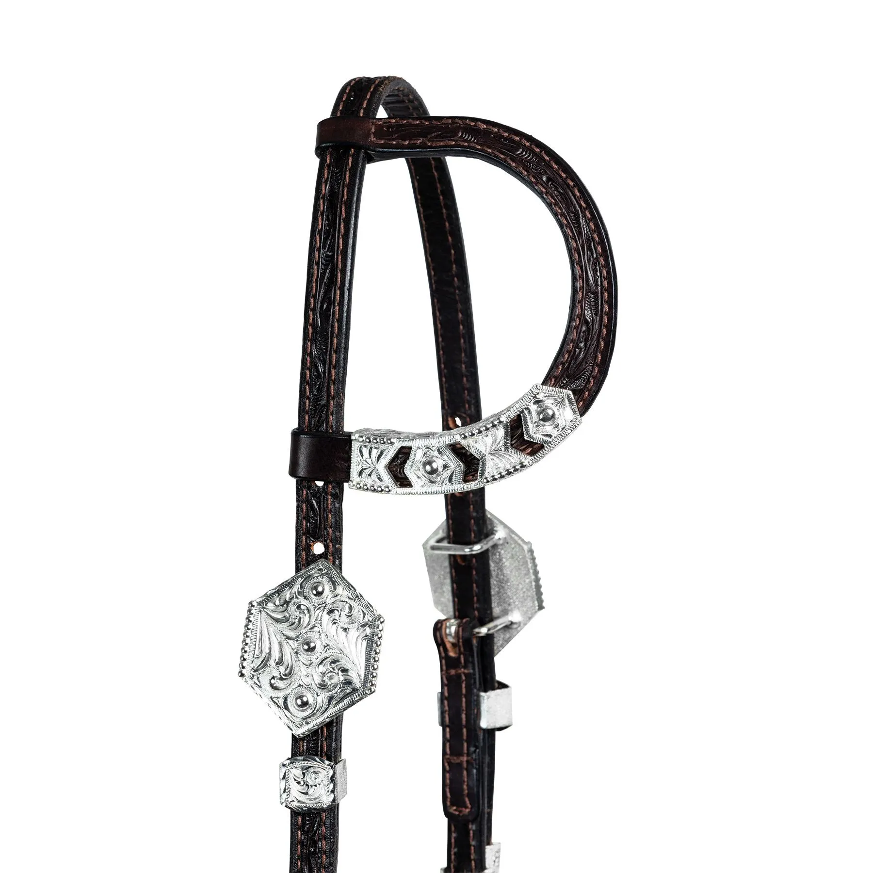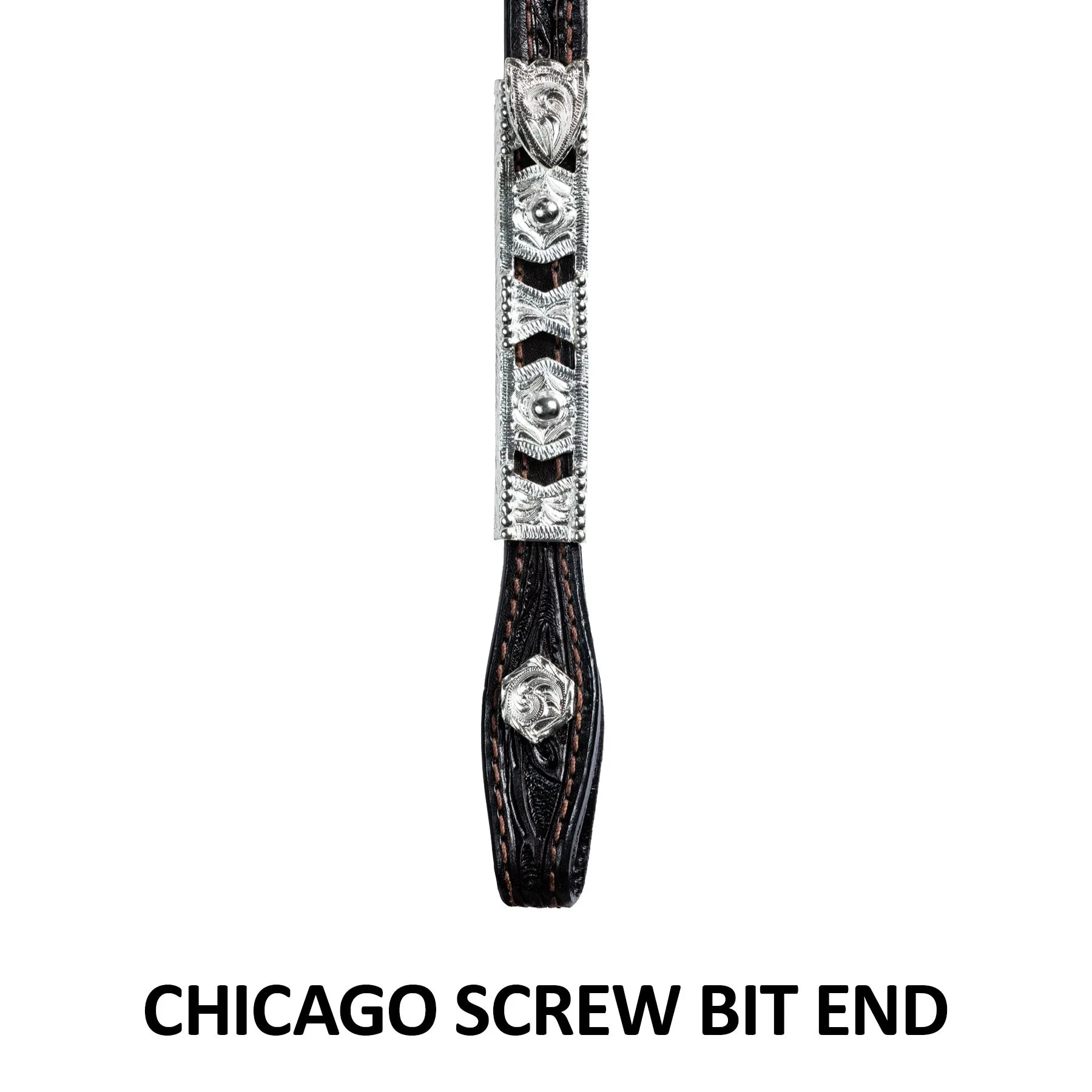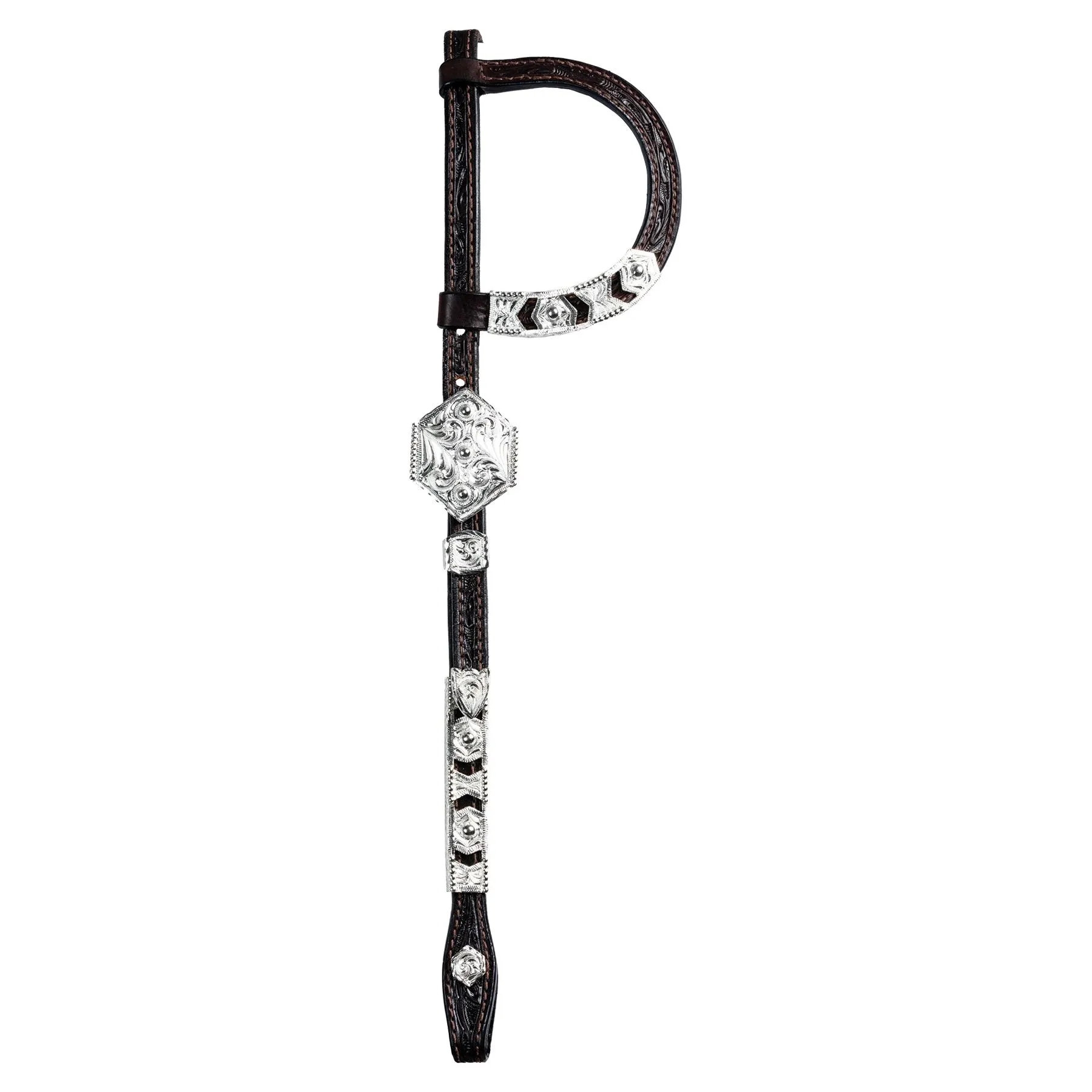 The fun silver cut-out design on this one ear headstall offers you a lower price without losing any show ring appeal. Cast Silver is an excellent alternate to hand tooled silver plate that doesn’t skimp on looks. One ear design with silver trim, buckle sets, and cheek silver. Concho bit end with chicago screws.