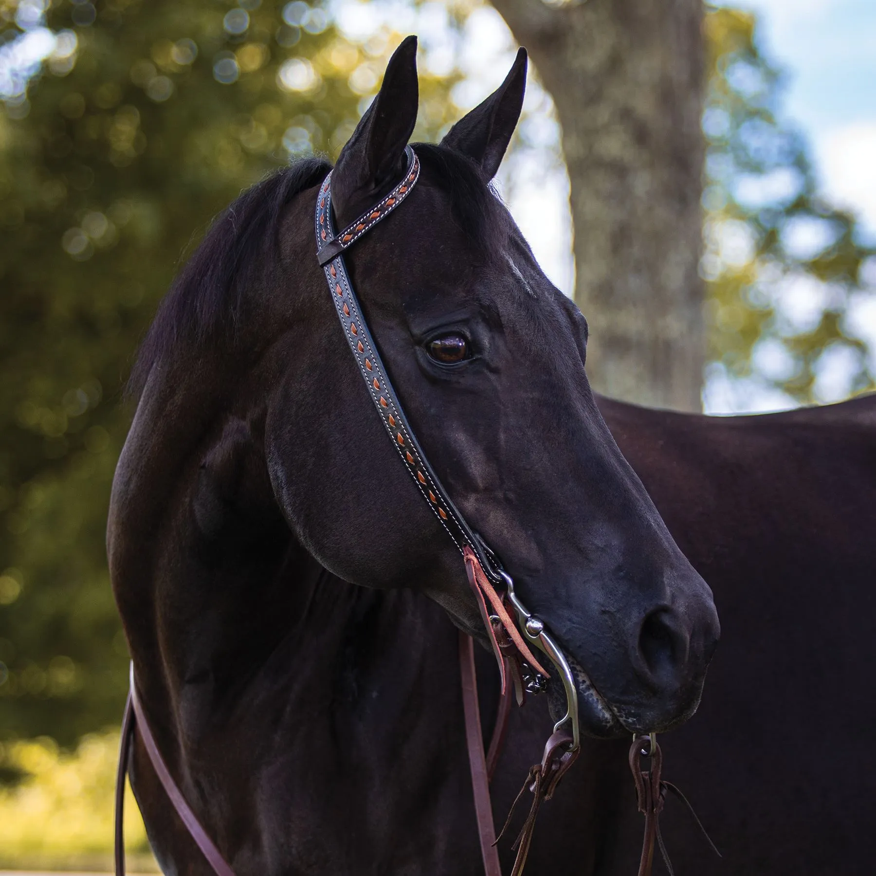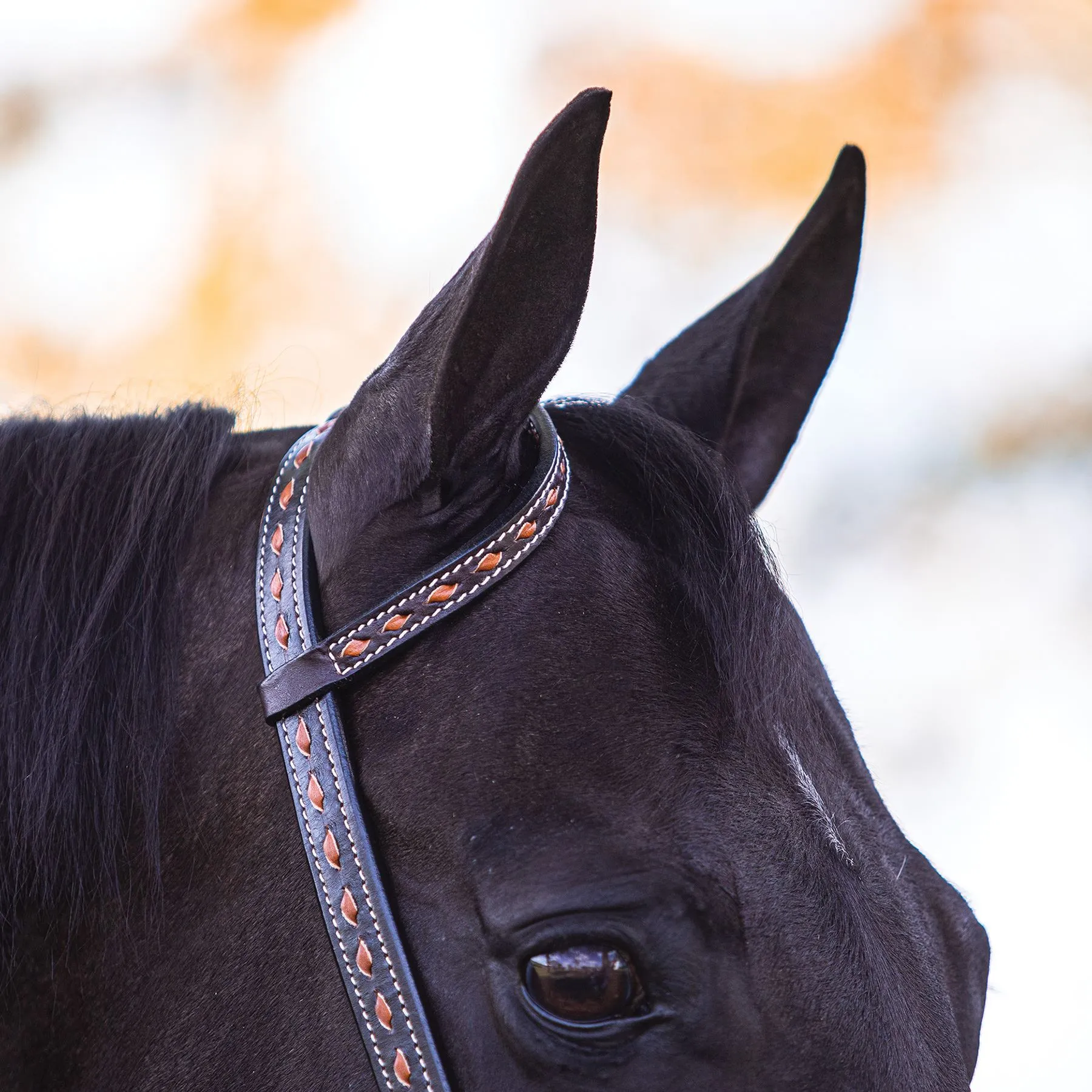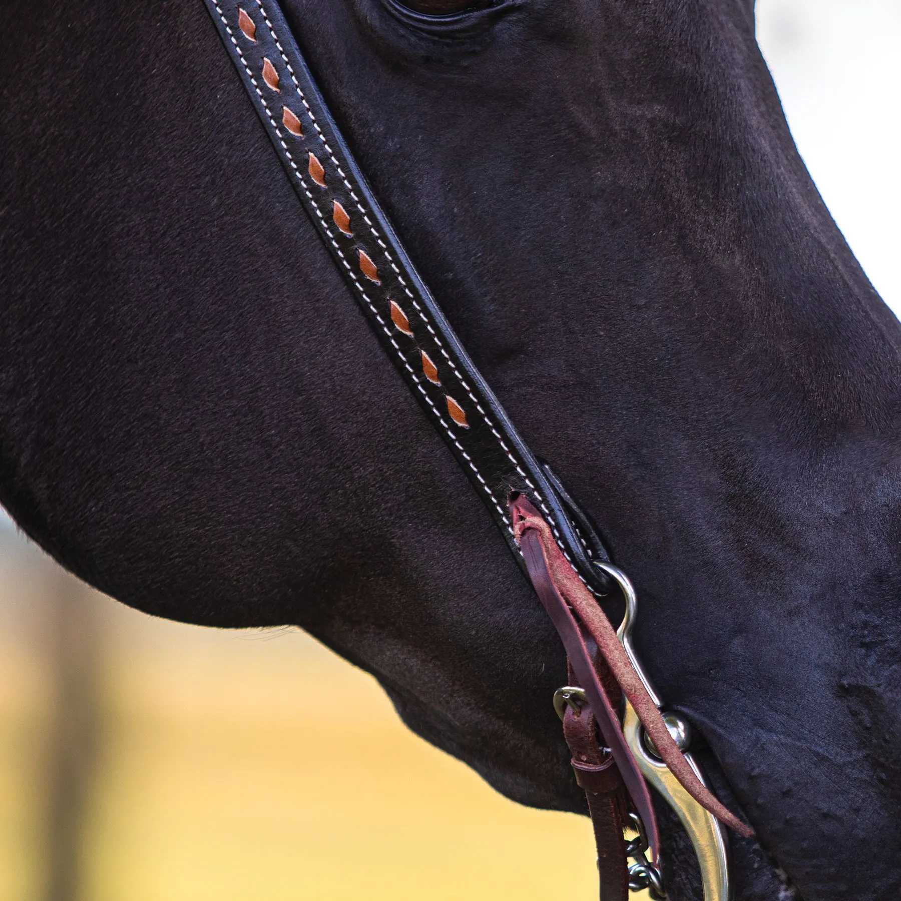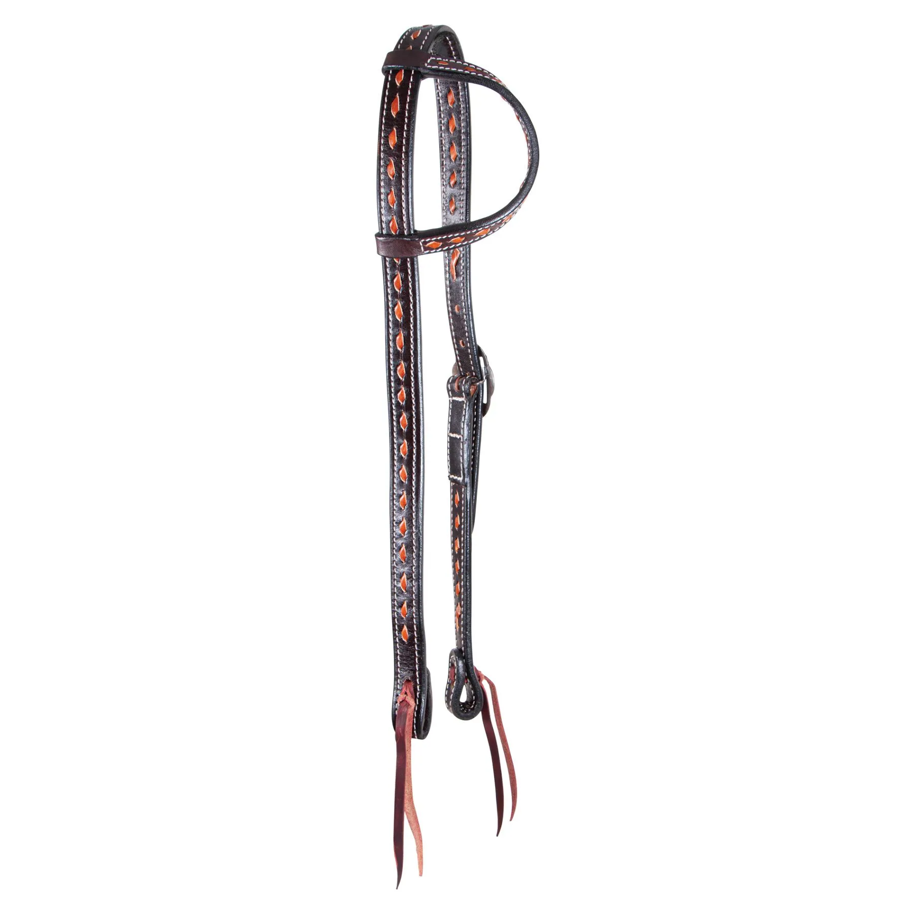 An old school style made new again. Classic tan leather buckstitch is the perfect one ear headstall for Ranch, Versatility, Cow Horse, Cutting or Trail. 5/8″ wide earpiece with a 1″ crown. Latigo tie bit end. Adjusts from 38 1/2″ – 44″.