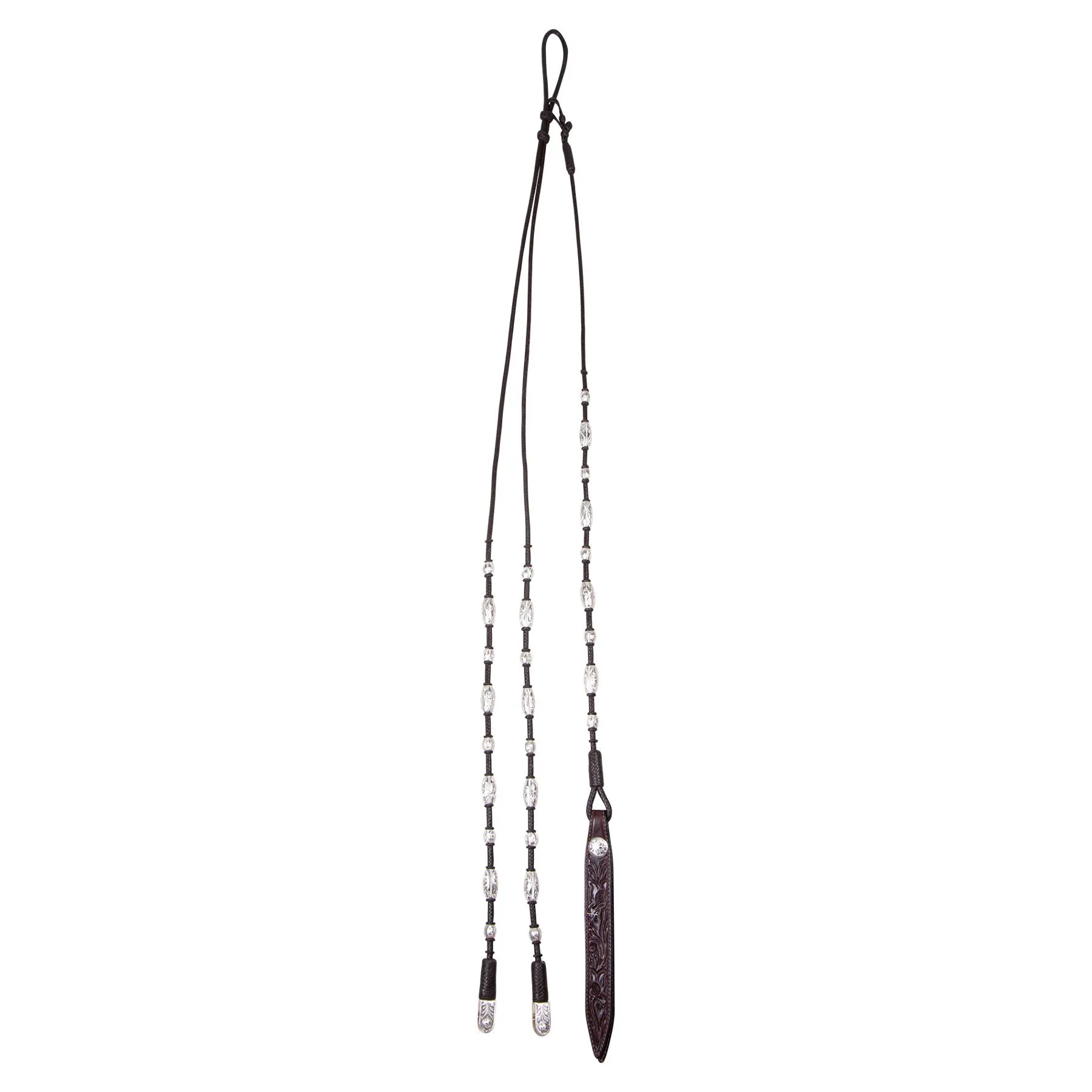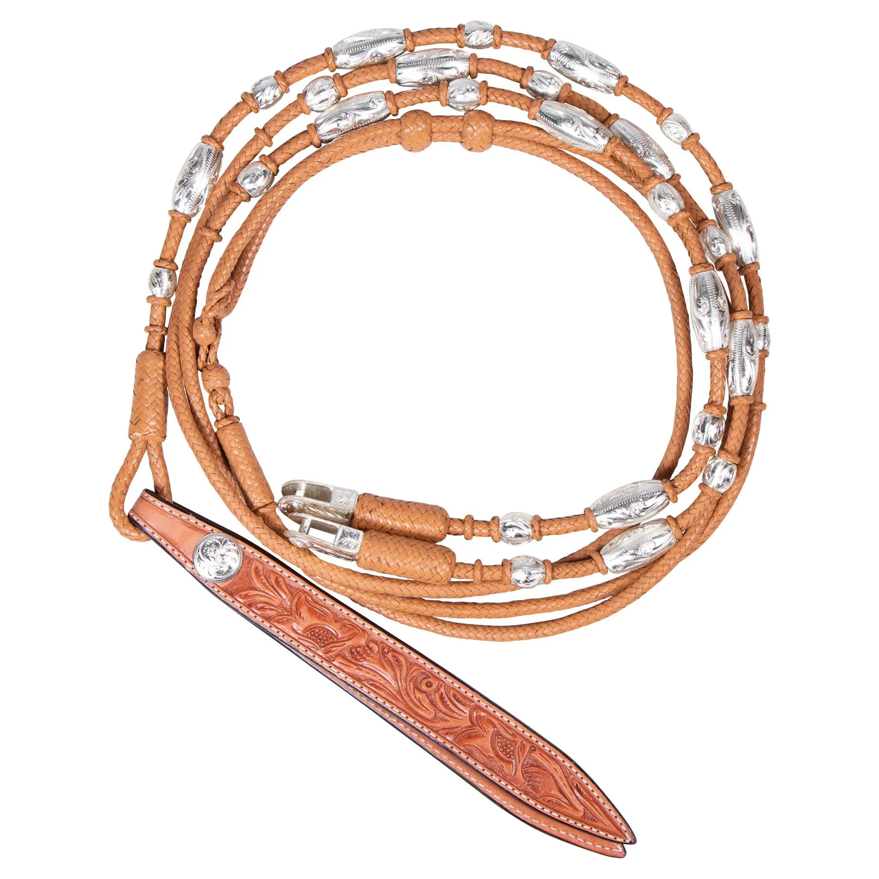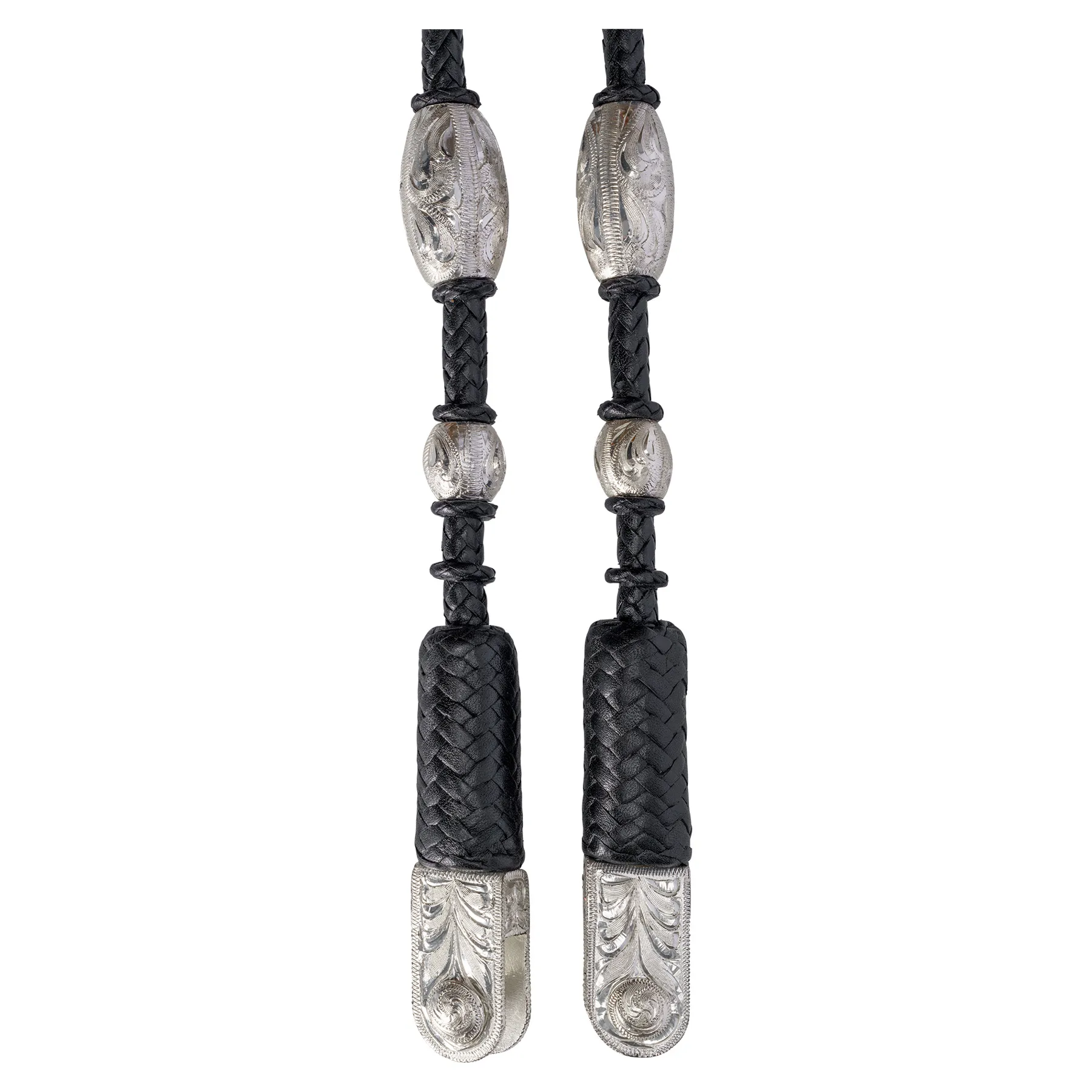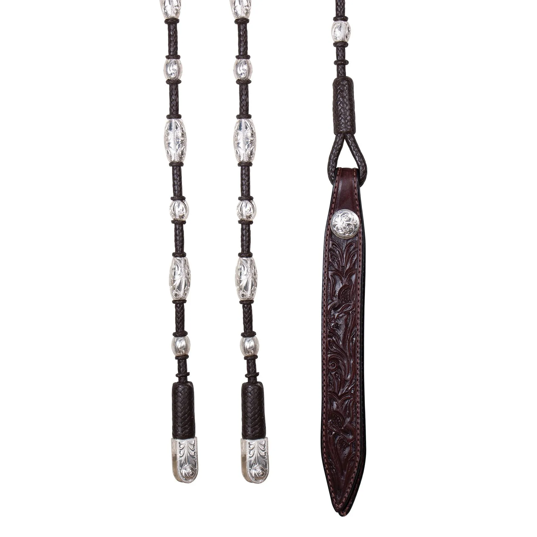 These direct contact leather romel reins are perfectly balanced and handcrafted from soft and supple Grade A Leather. These leather romel reins are hand braided in a 12-plait pattern for an exceptionally smooth feel. The hand-tooled sterling silver accents and a stylish ball and barrel popper complete the look of these gorgeous reins. A patented bit connection allows direct contact from the bit to your hands. At the same time, these perfectly balanced leather romel reins form a beautiful drape with little movement.