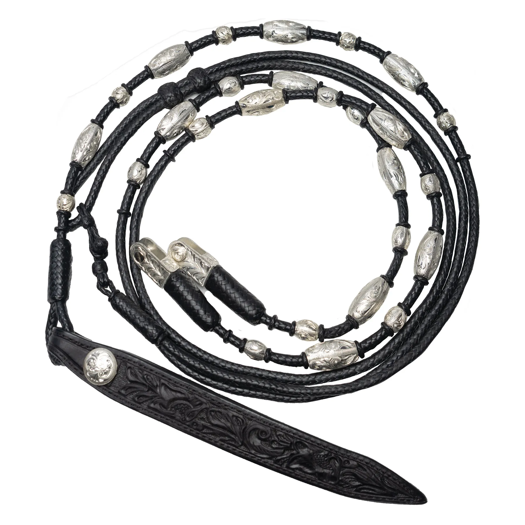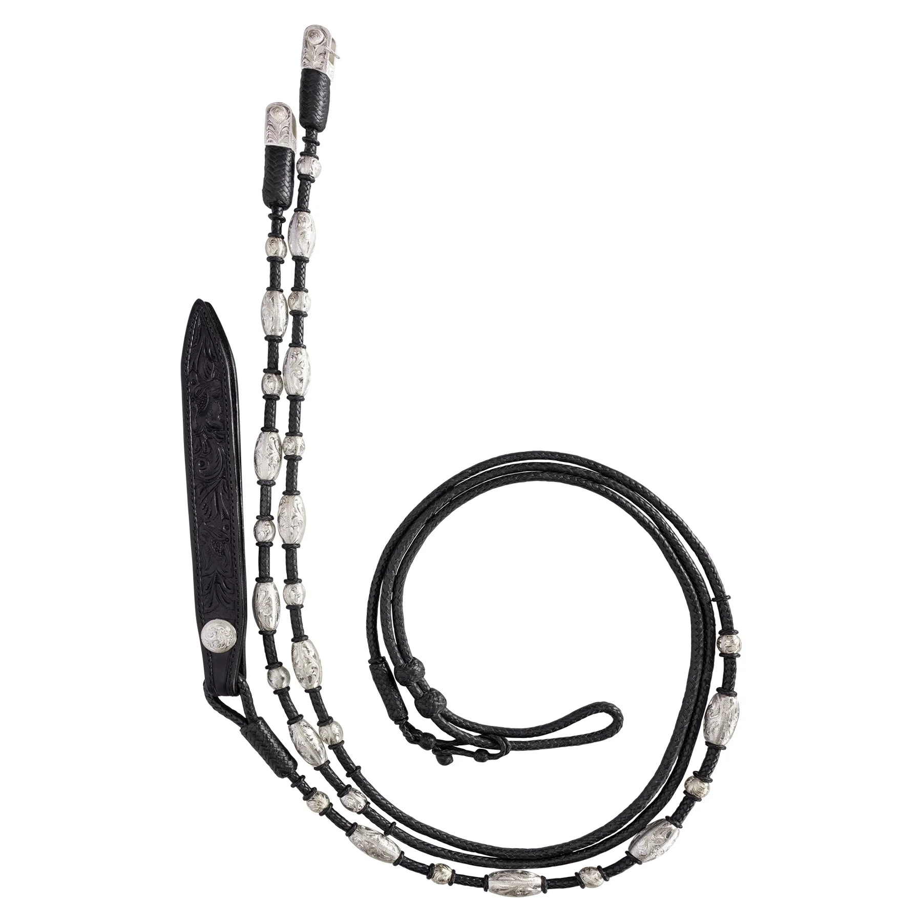 - Popper is hand-tooled with a sterling silver plate concho