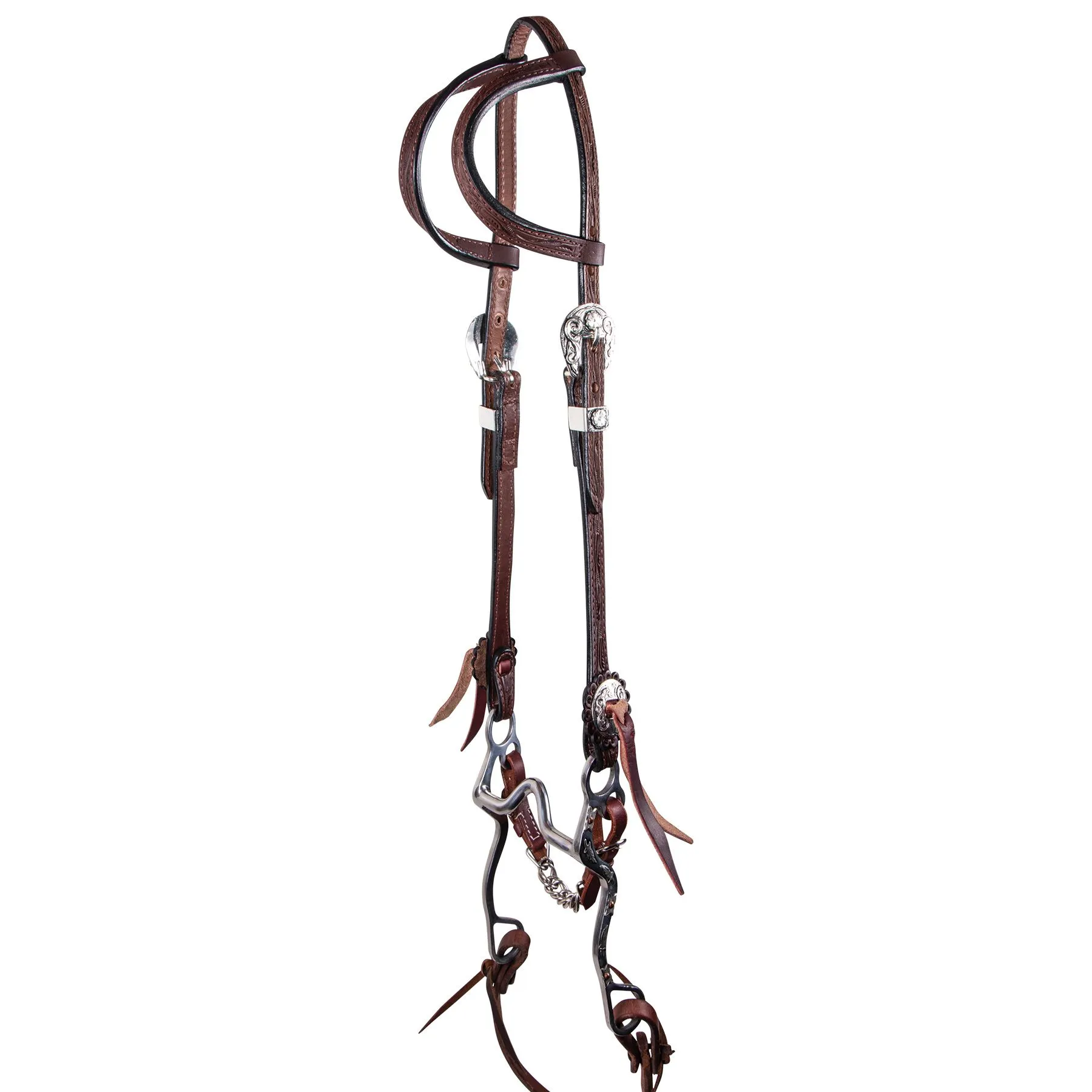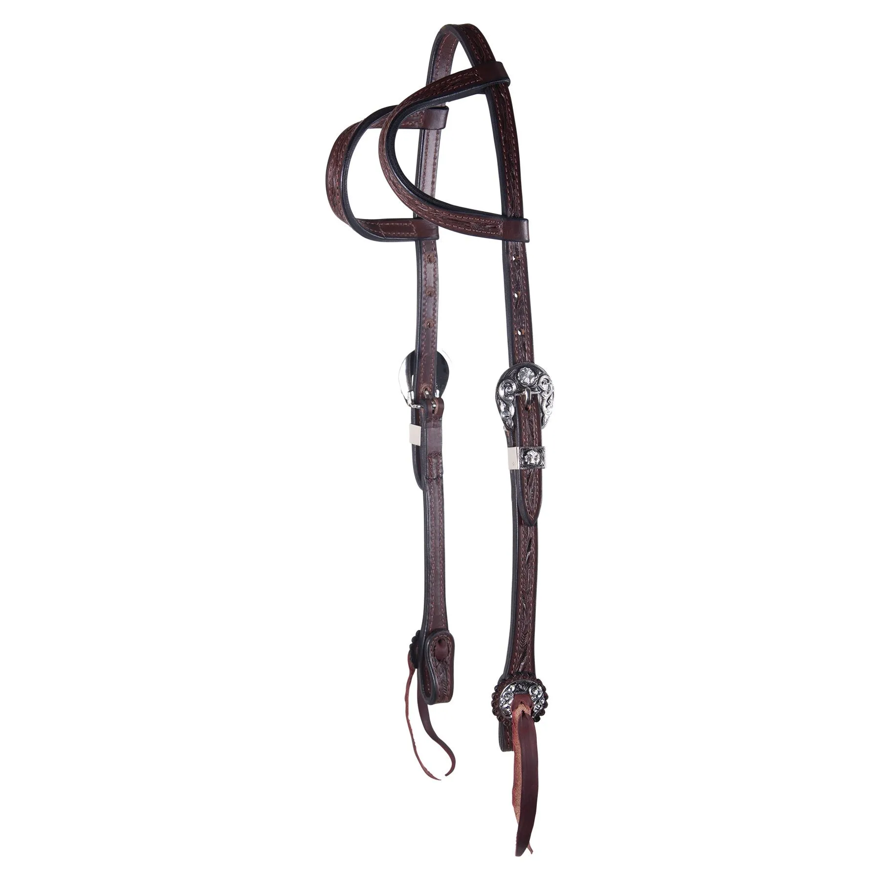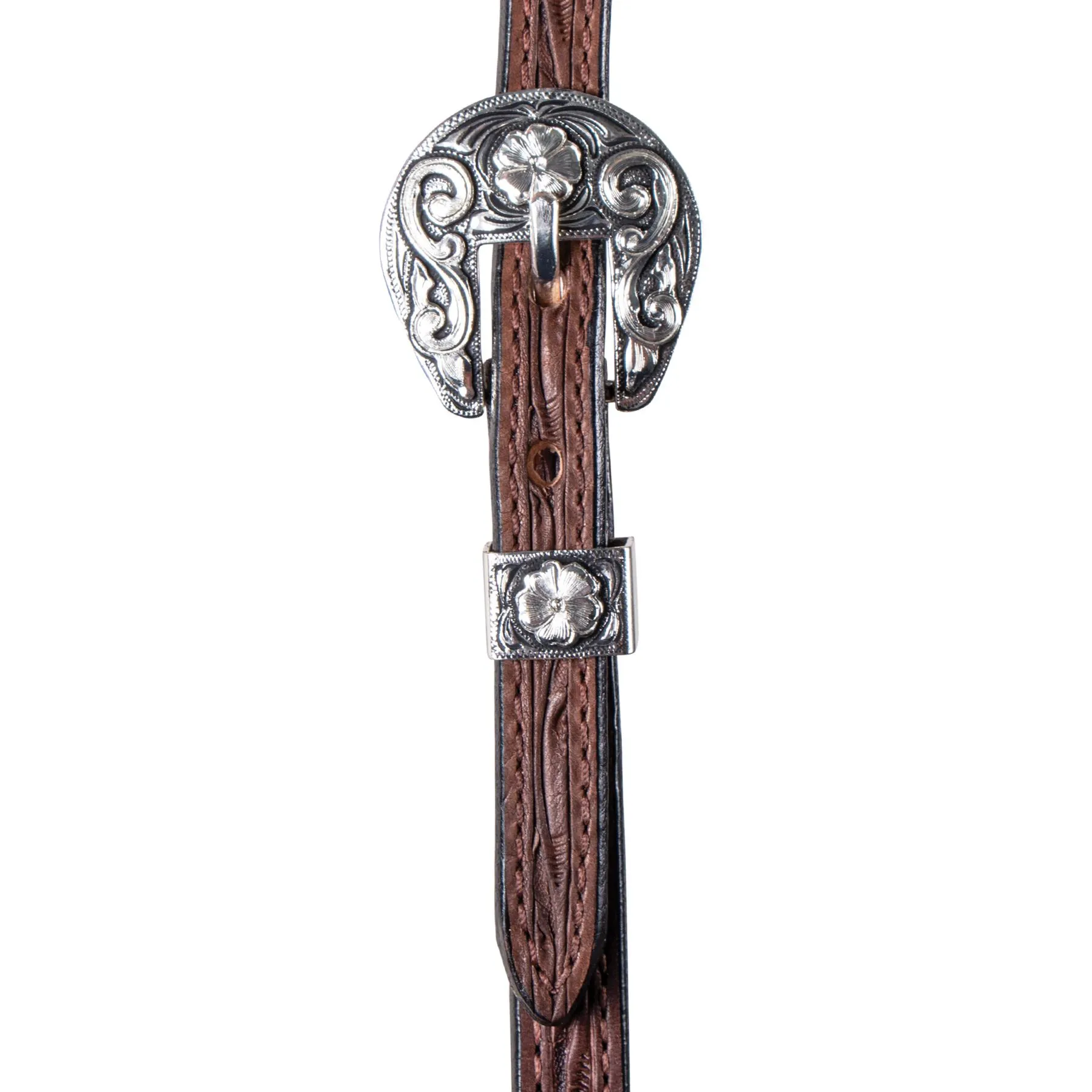 - Hand tooled with silver plate buckles, keepers and conchos at the bit end with just a hint of antiquing