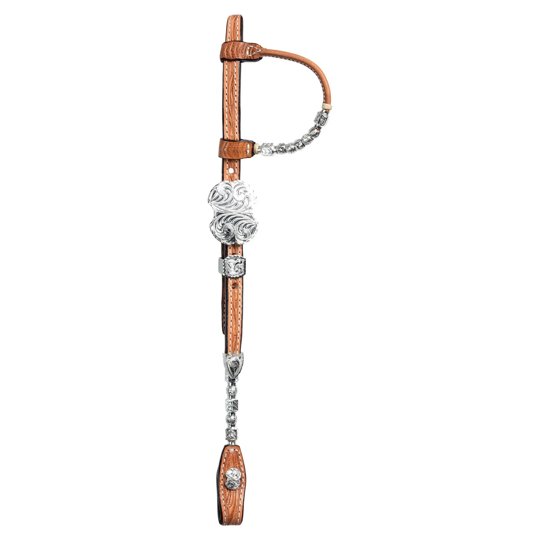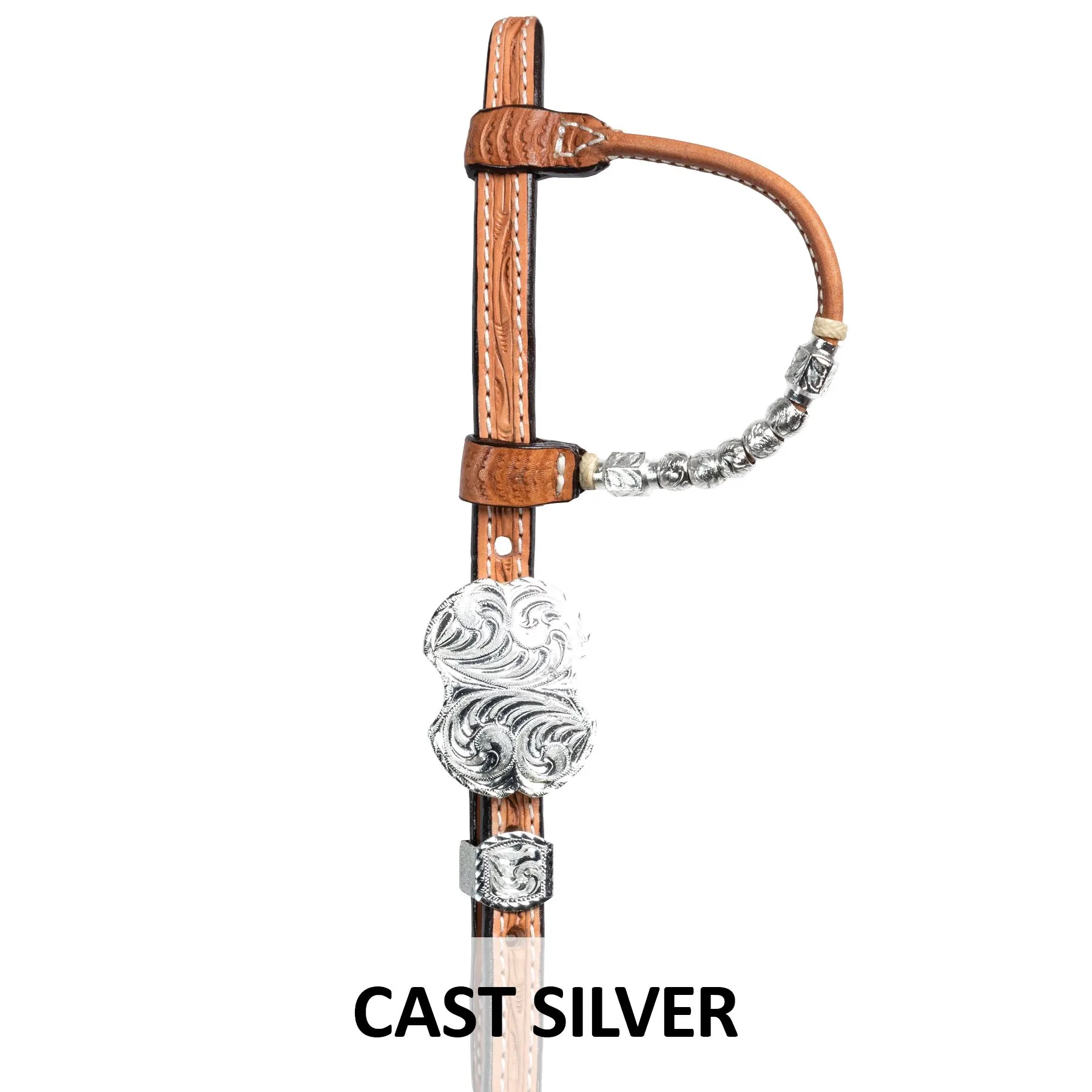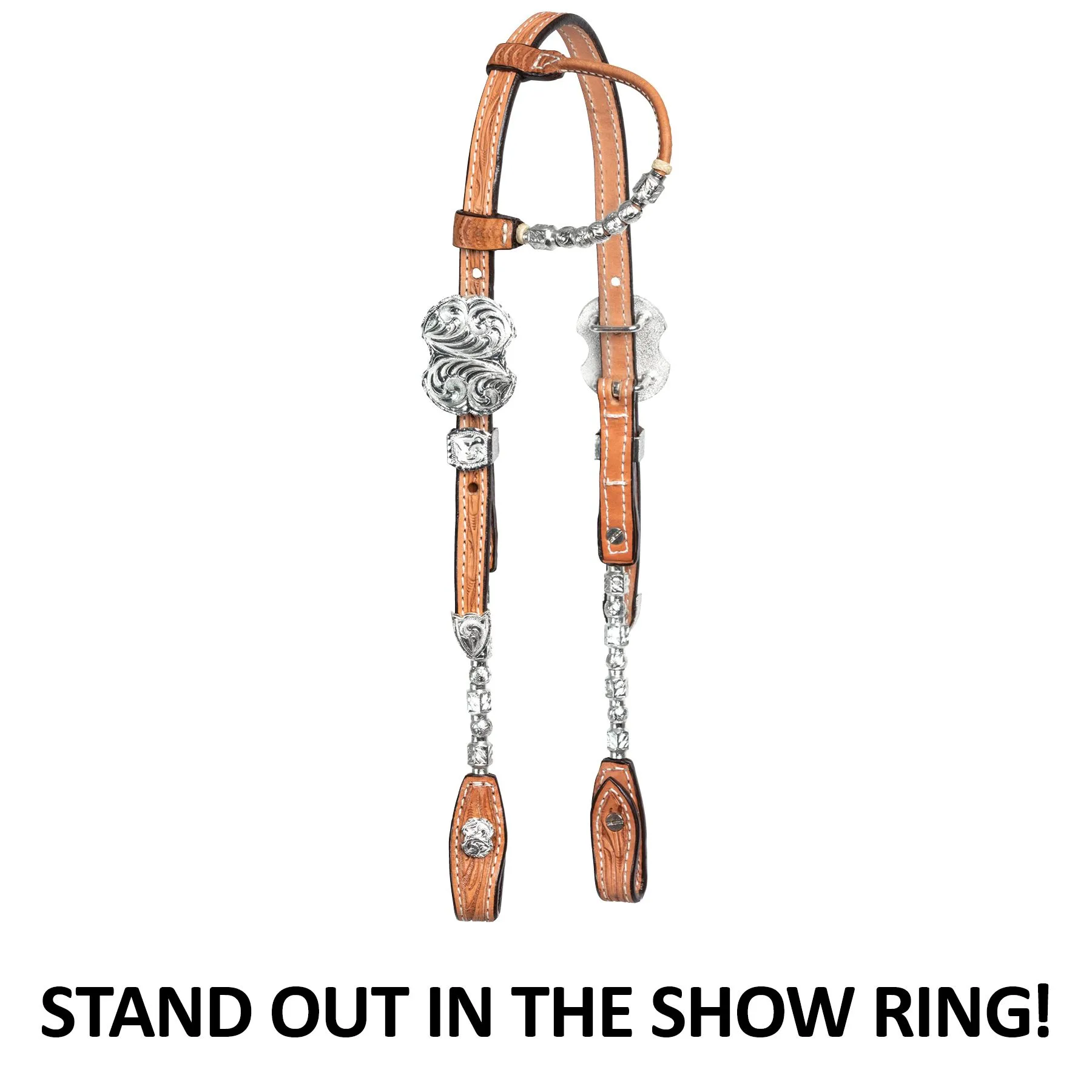 This one-ear show headstall, made from Grade A bridle leather, stands out in the show ring with its beautiful stamped silver plate detailing on the earpiece and cheeks. The two-tone leather over the crown with silver dots and hand-tooled leather cheeks with square silver plating give the headstall an attractive appeal. The one-ear piece is designed with silver tubes and ferrules and is lightly oiled with a dark inlay crown.