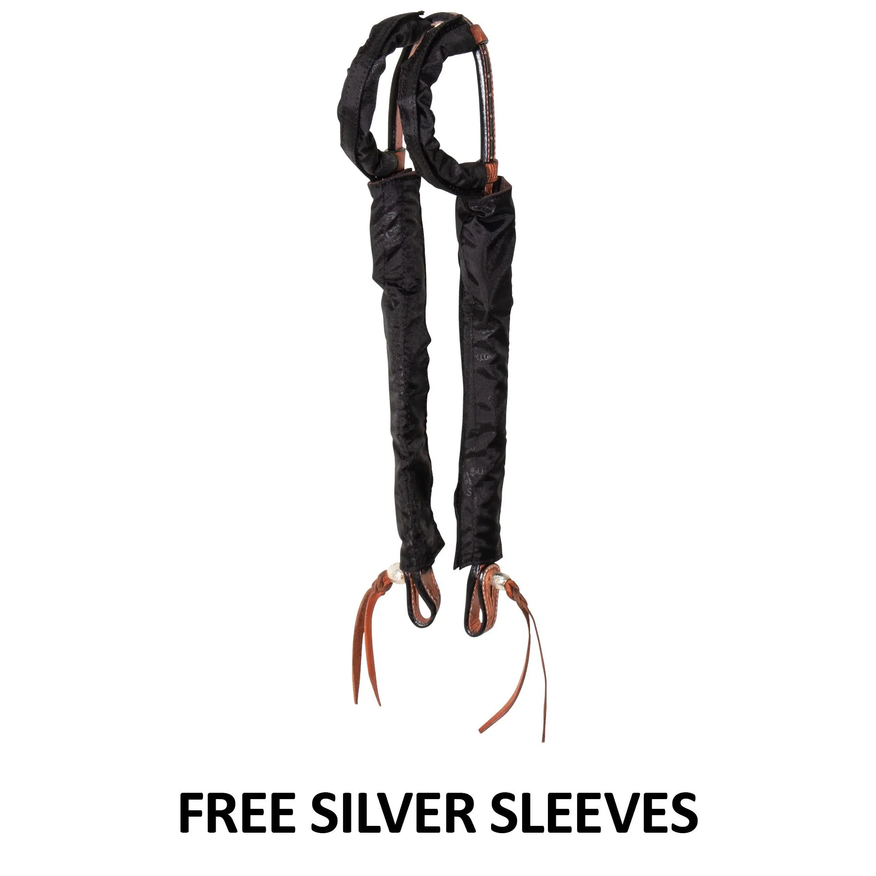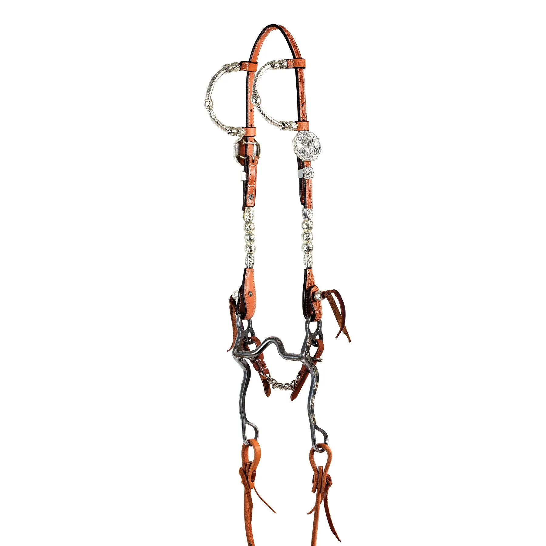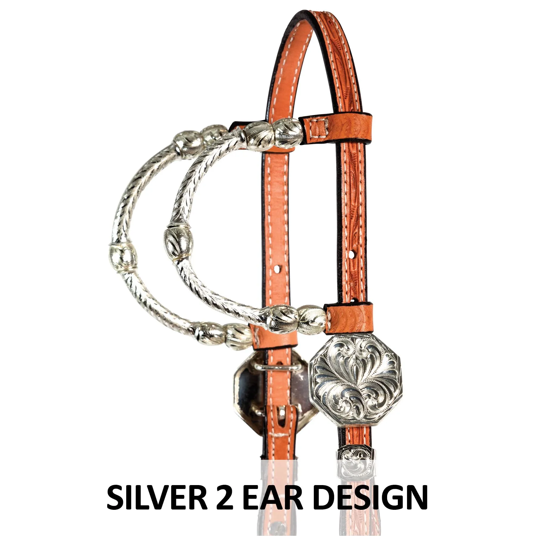 Hand engraved sterling silver plate detailing on the ears and cheeks. Hand tooled leather cheeks with hand rubbed edges, silver plating. Two ear with silver tubes and ferrules.
