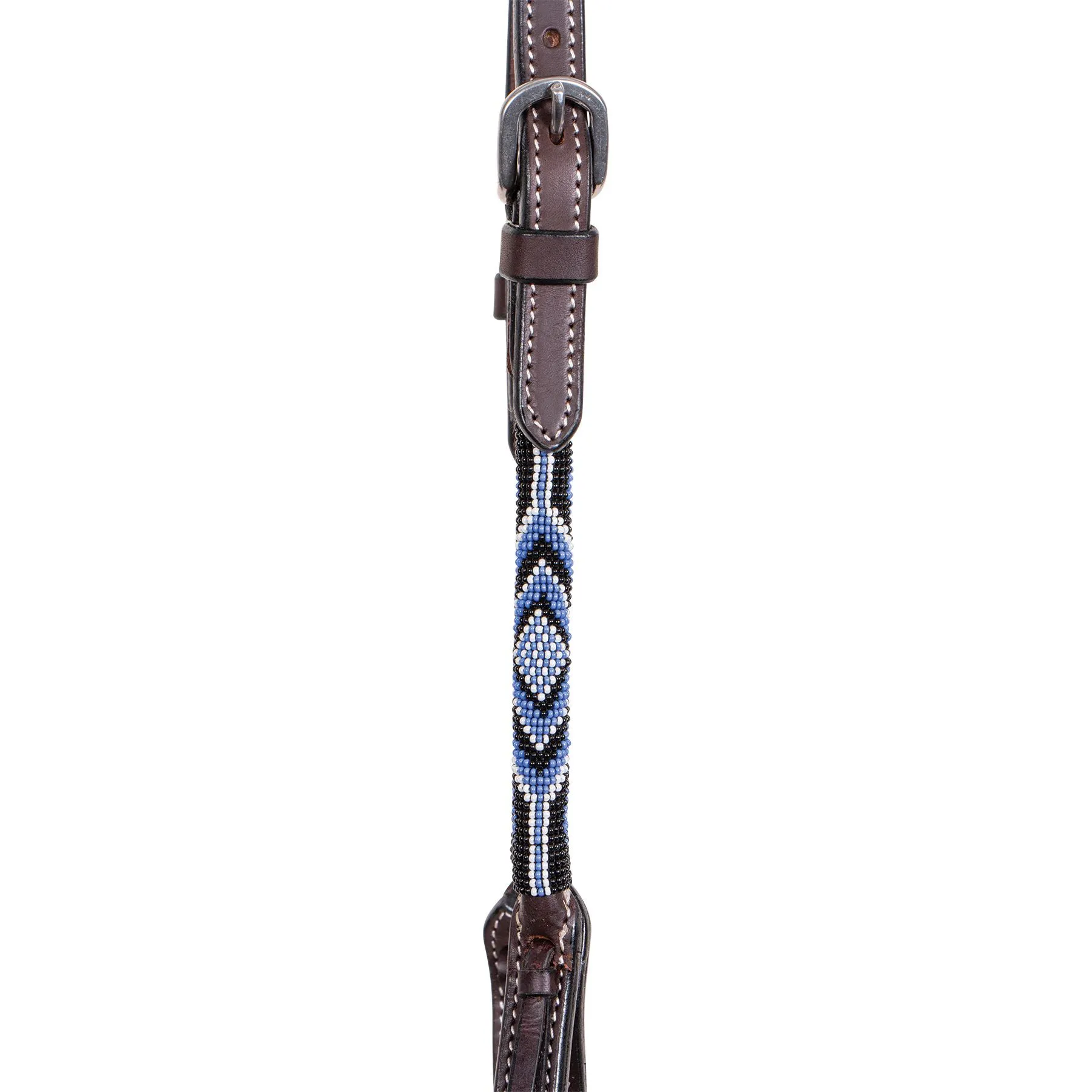 - Leather keepers, stainless steel hardware, and ties at the bit end