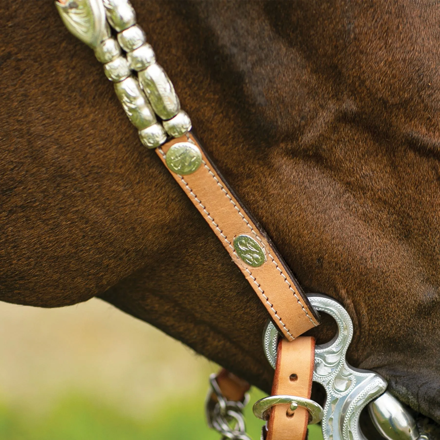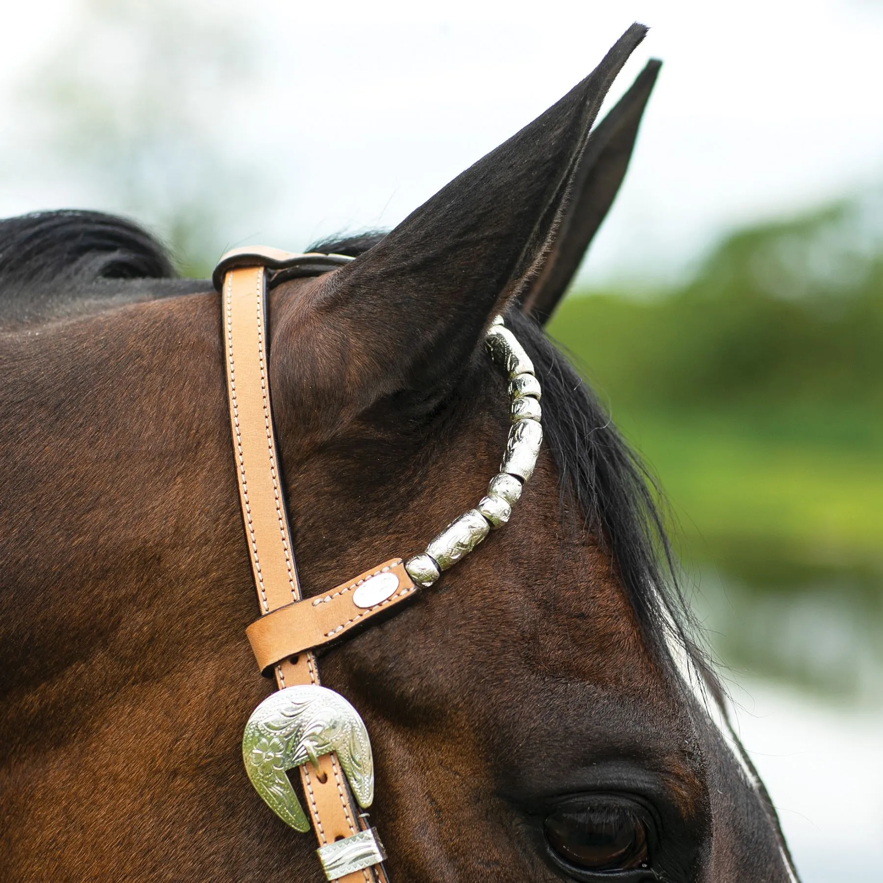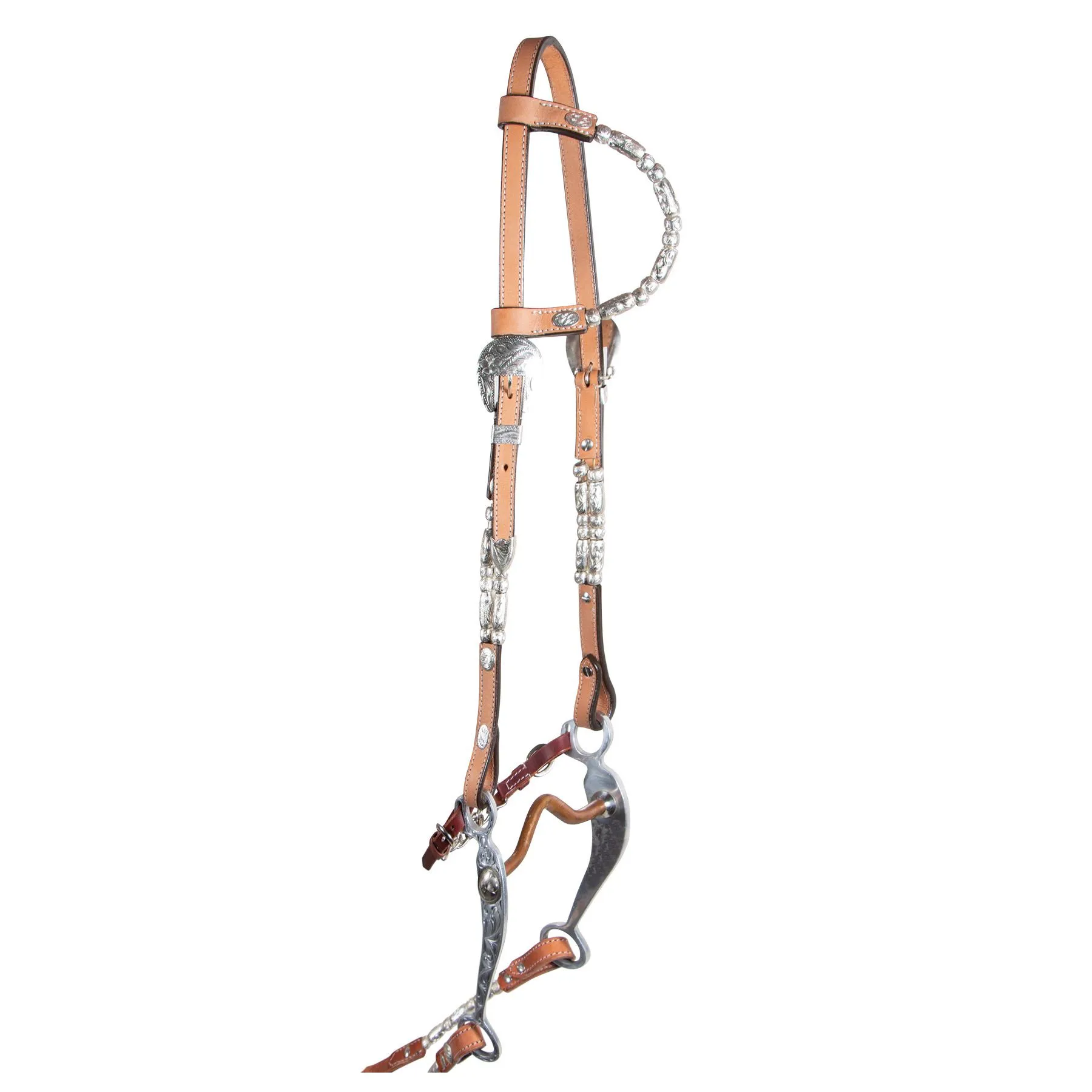 A beautiful one-ear headstall with double light oil leather with silver plated with ferrule and double ball strands cheeks, perfect for the beginning or entry level competitor.