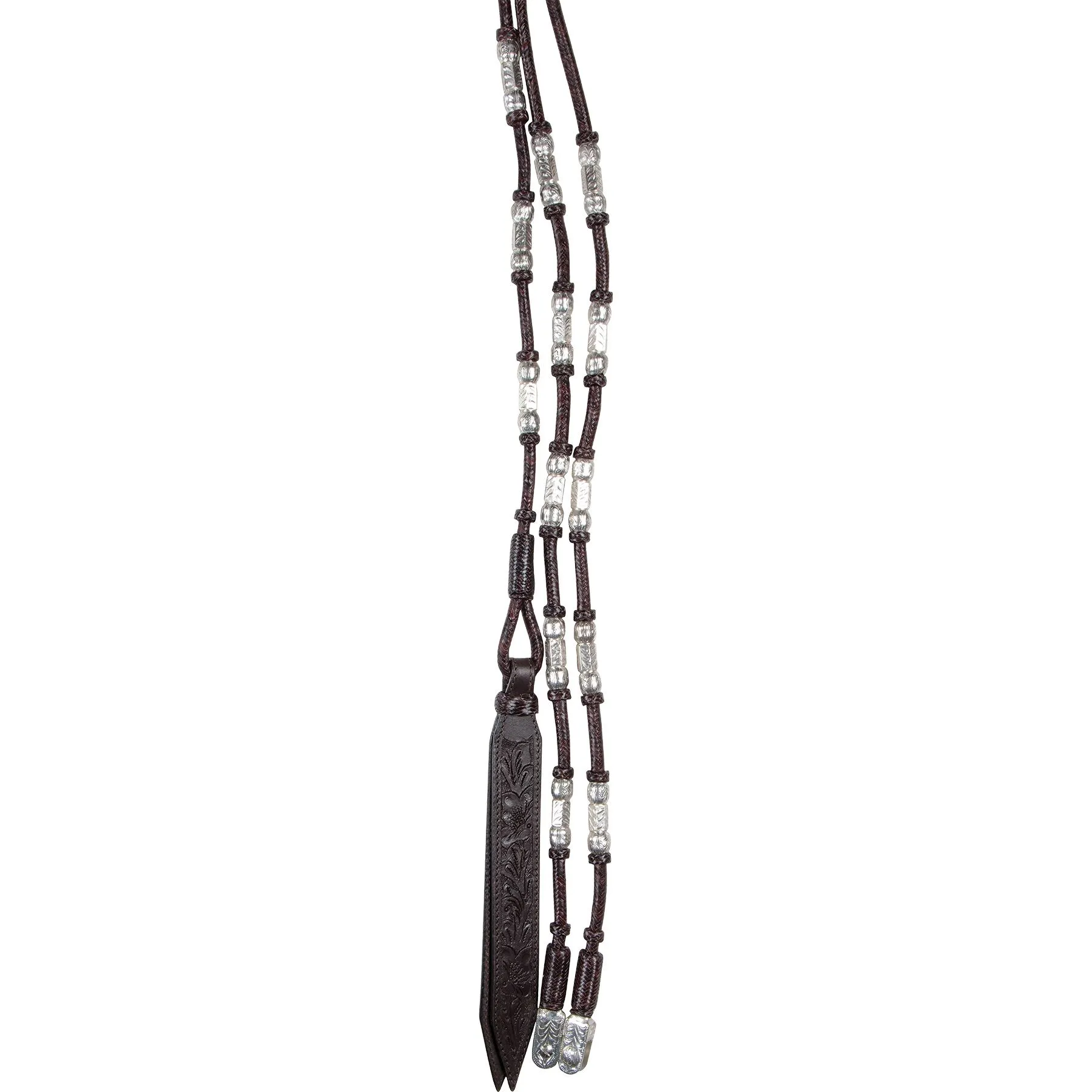 - Hand braided 12-plait 3/8″ rawhide with tooled leather popper