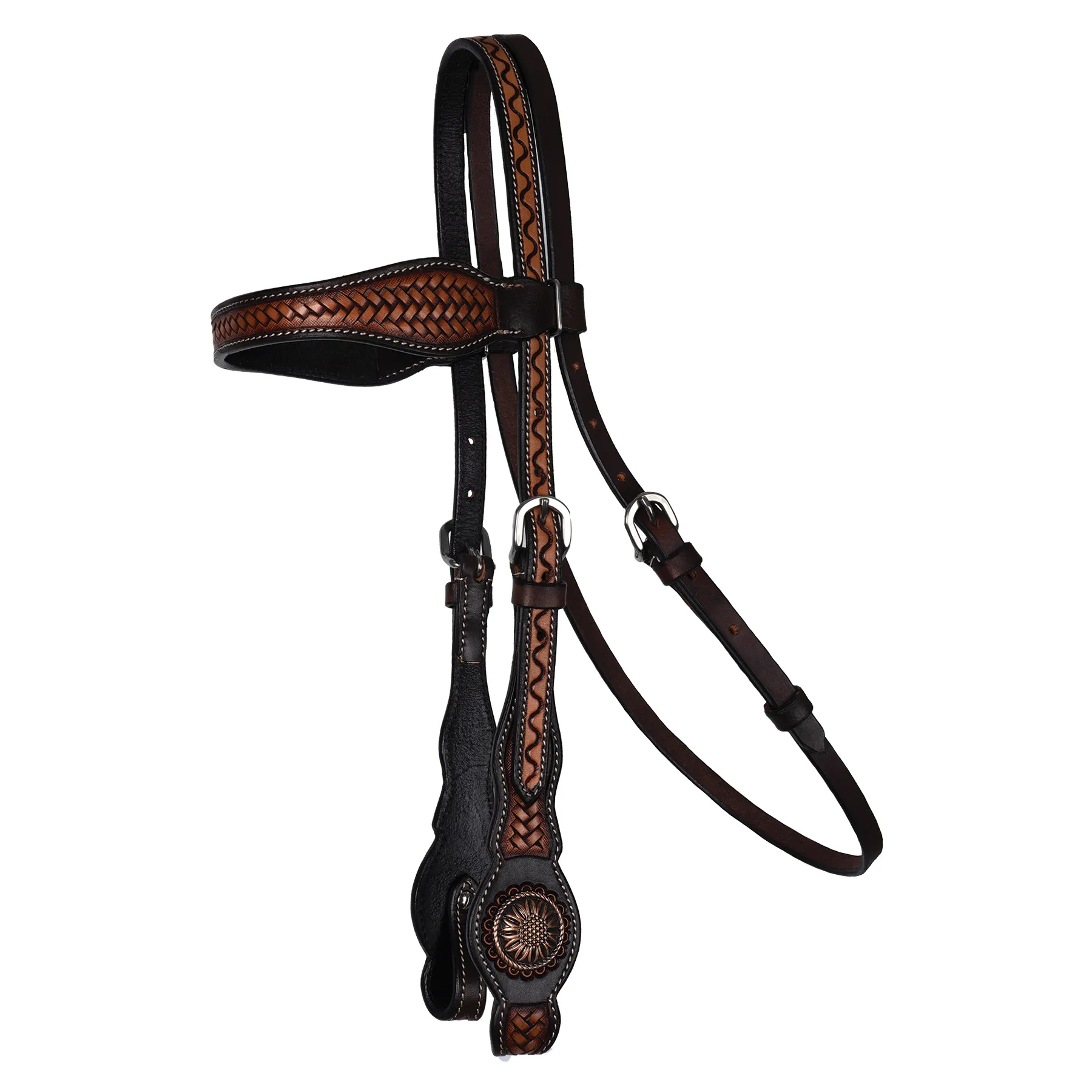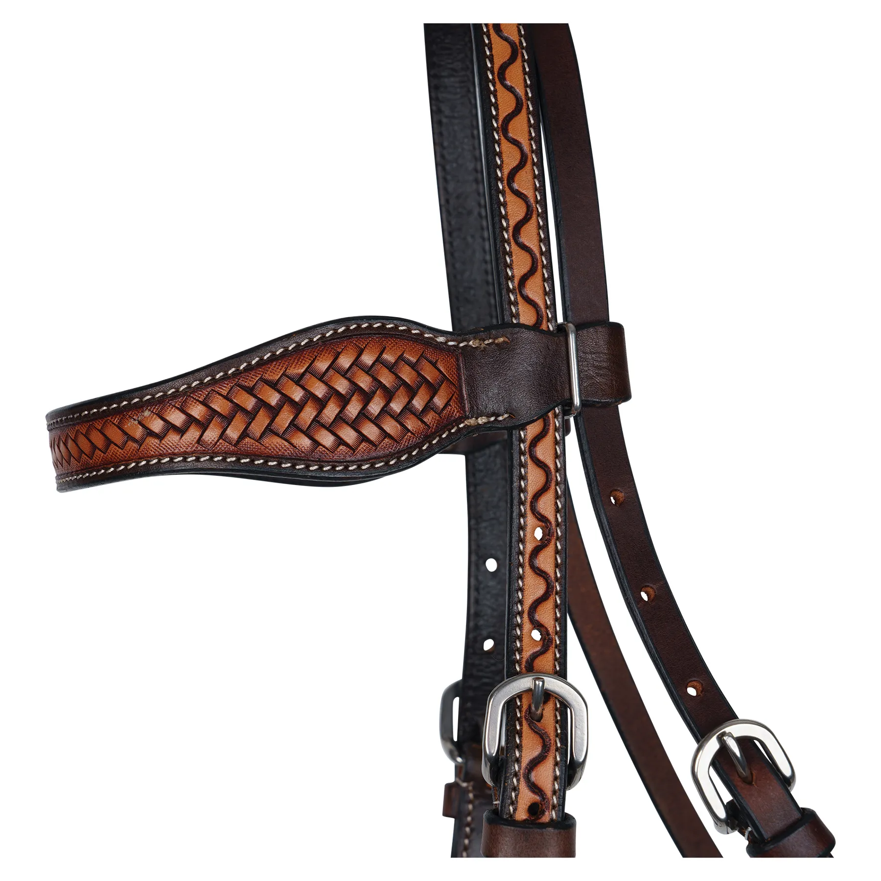 - Hand-tooled browband headstall with a light leather base and dark oil trim accents