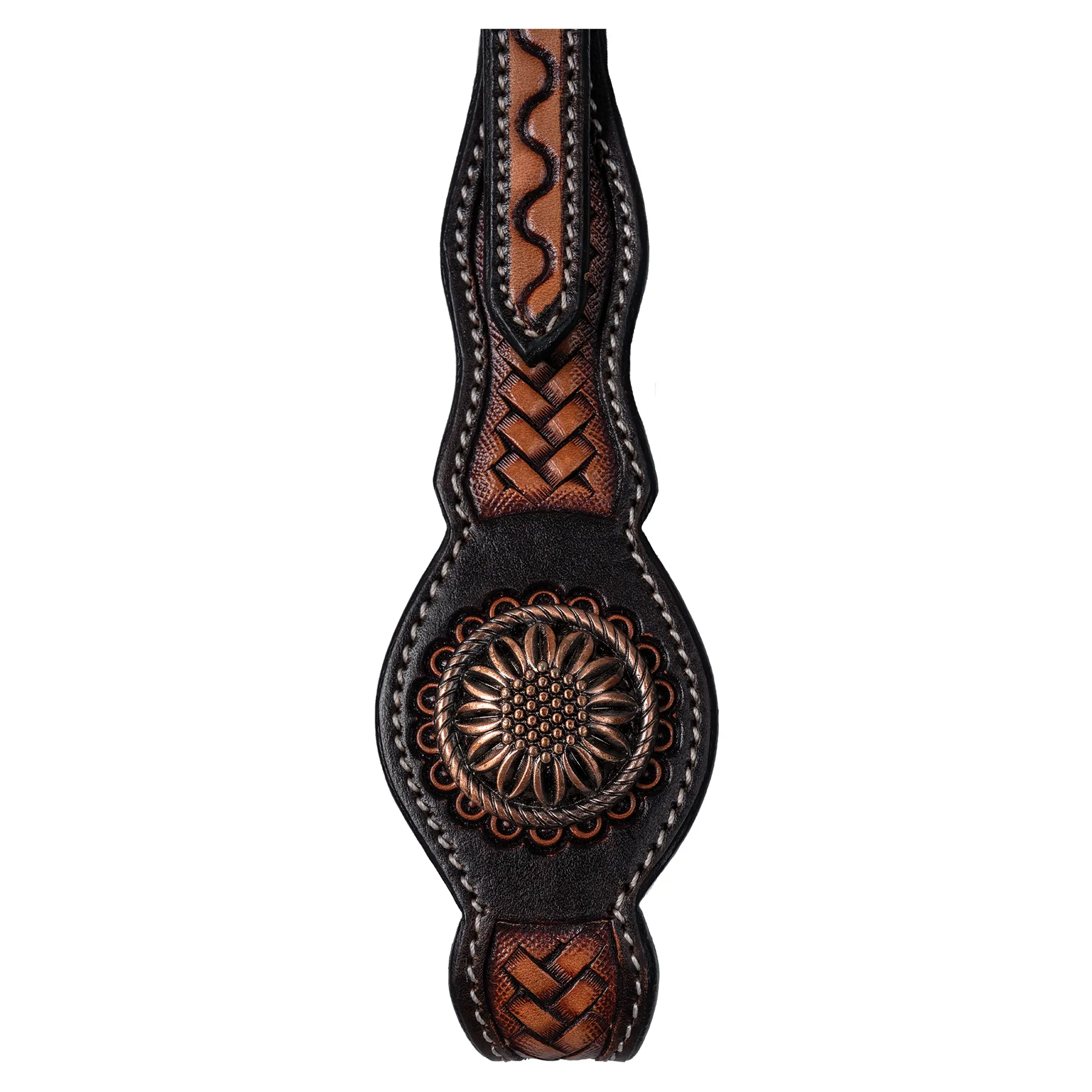 The Double S Tooled Concho Browband Headstall is a great choice for Ranch classes or trail riding due to its beautiful design and functionality. The adjustable straps and durable construction blend functionality and style, ensuring an enjoyable ride. This headstall combines dark and light oil, features basket tooling, and is decorated with antique copper daisy conchos for a unique look. Plus, it works with snaffle, bosal, or curb bit styles.