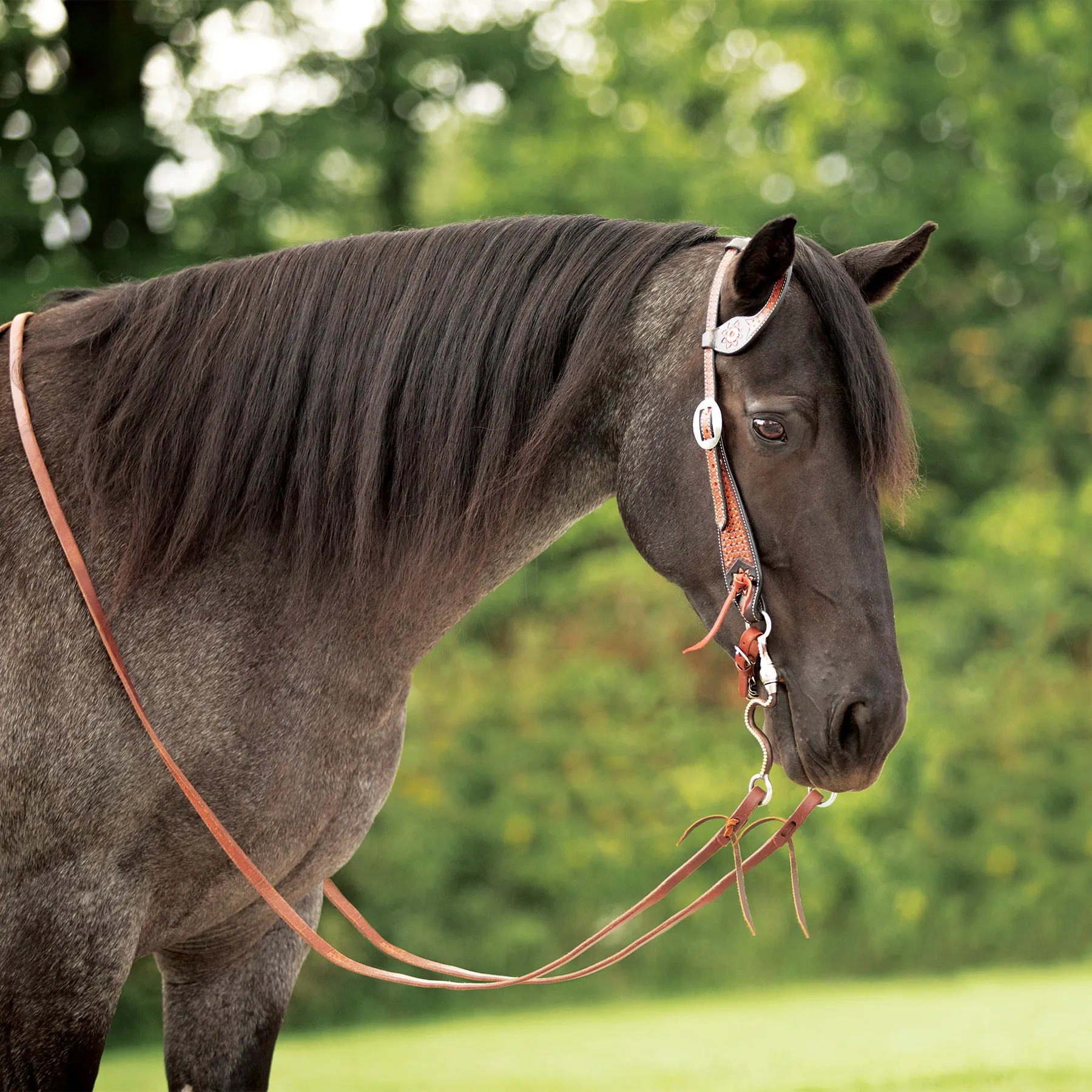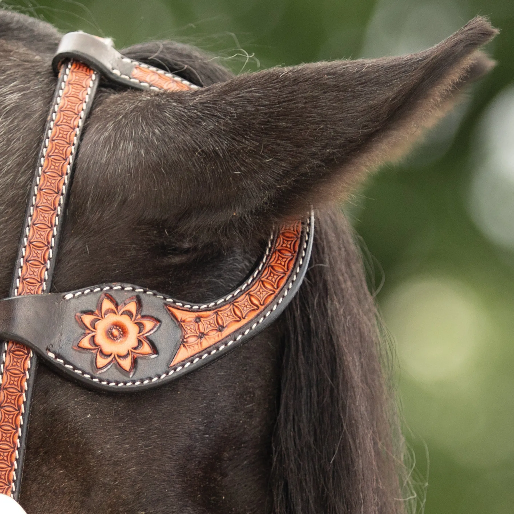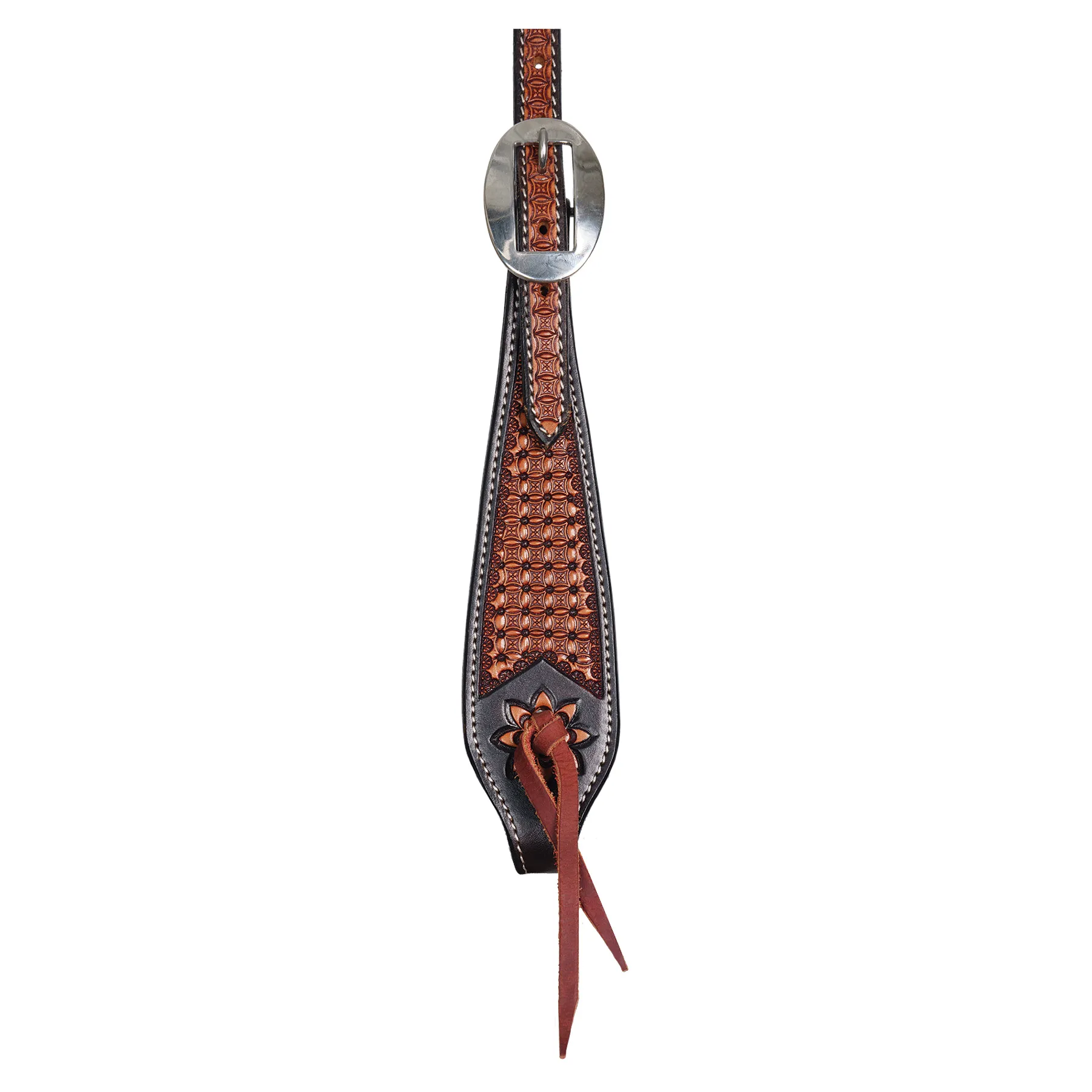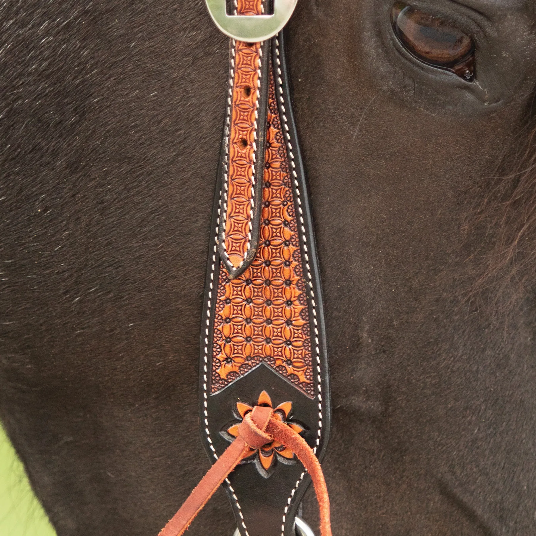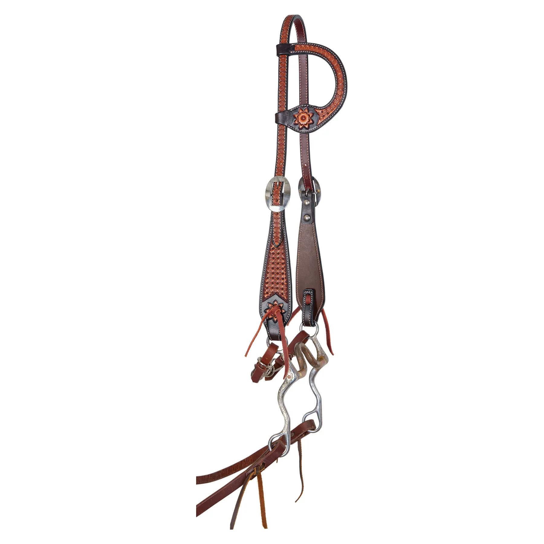 Stand out with this beautiful two-toned one-ear headstall with a flower design. This attractive headstall boasts unique hand-tooled daisy accents at the ear and bit end, while the cheeks are tooled with a 3D box and flower tooling pattern. This is a unique addition to your headstall collection for your ranch, trail, or working horse.