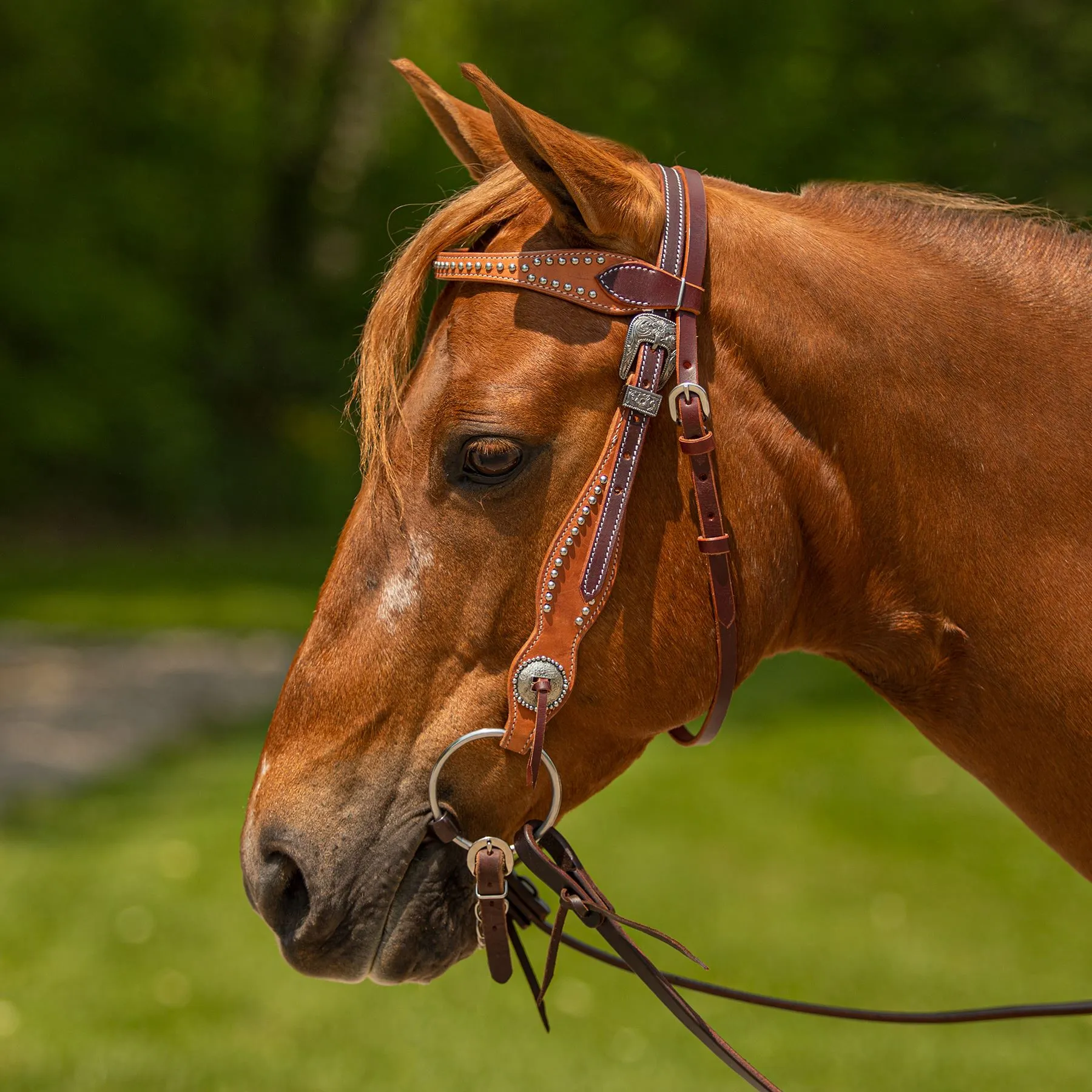 Browband bridles are perfect for snaffle bit horses and daily training. Dark leather turnbacks on light ear and cheeks, with silver stud accents for an attractive look on any horse!