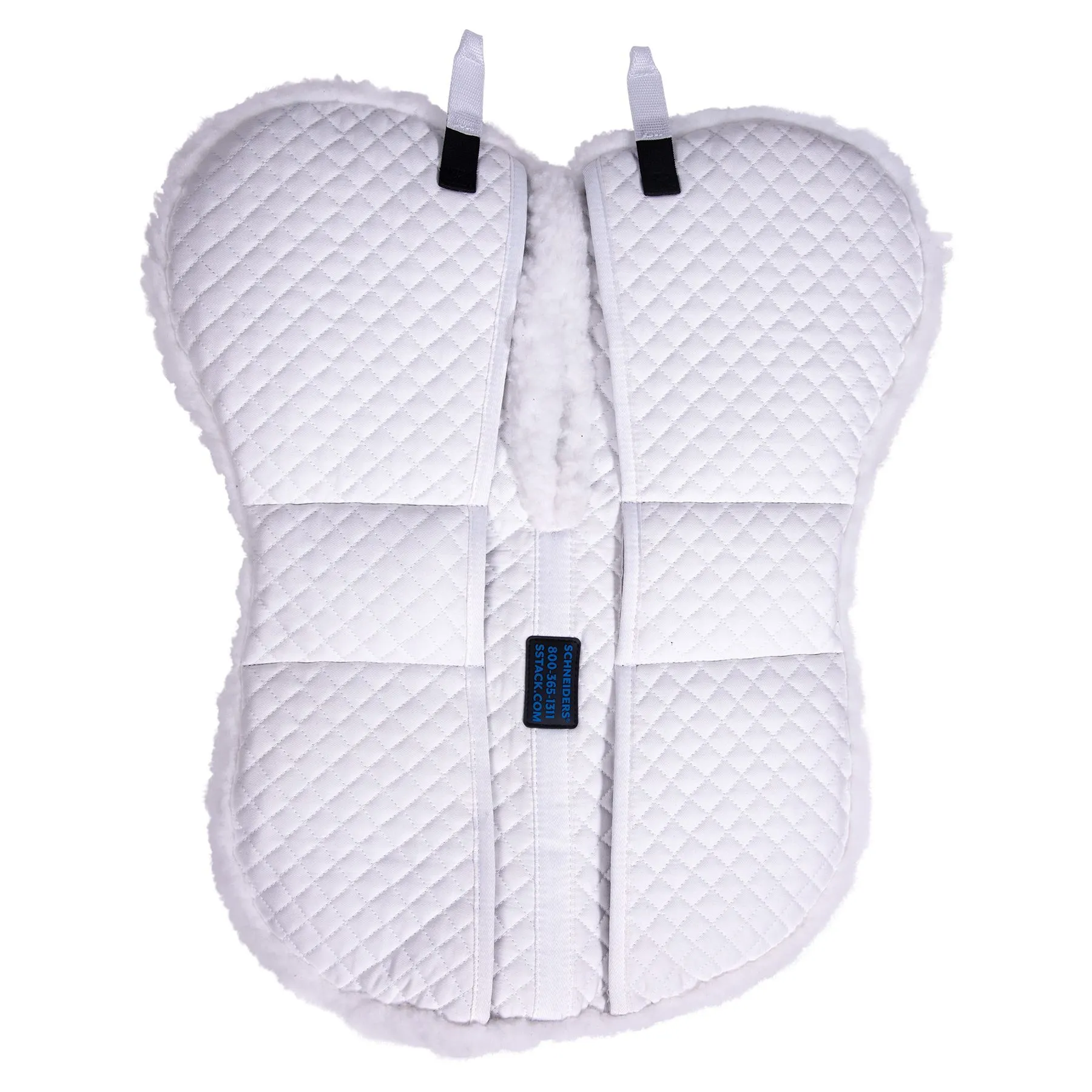 The Dura-Tech® Verashim Fleece Lined 6 Pocket Shim Half Pad is designed to offer a custom fit for even the most challenging of horse shapes. This shimmable half pad eliminates wither pressure and does not restrict shoulder movement. It is made from a soft, durable, quilted cotton top and fleece with layered foam, wool felt, and crush-proof memory foam. The pad features six pockets and comes with three sets of varying shim thicknesses (18 shims total), allowing you to tailor the fit precisely. The cut-away wither design eliminates pressure and promotes free shoulder movement. With a center spine length of 23 1/2″ and a side length of 25″, this pad fits most saddles. It can be conveniently attached to saddle D’s with small front hook and loop closure tabs. Machine washable and available in white, this pad offers both practicality and style.