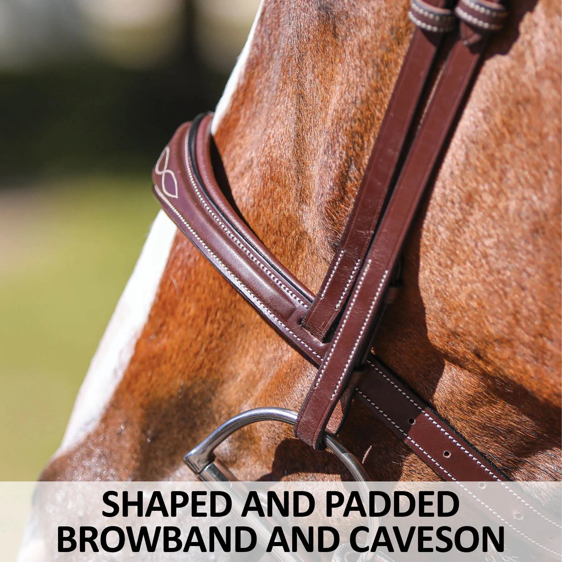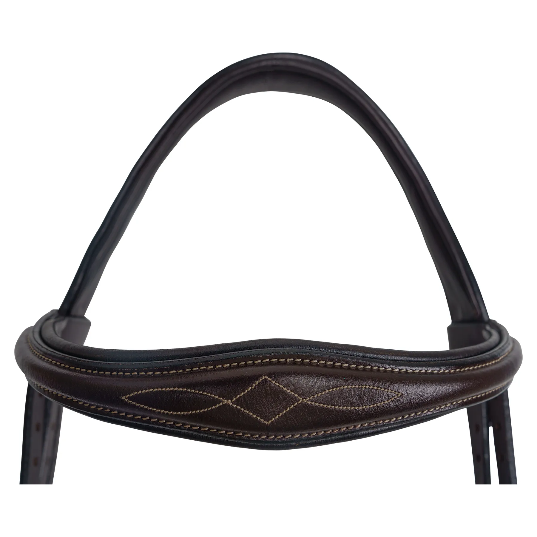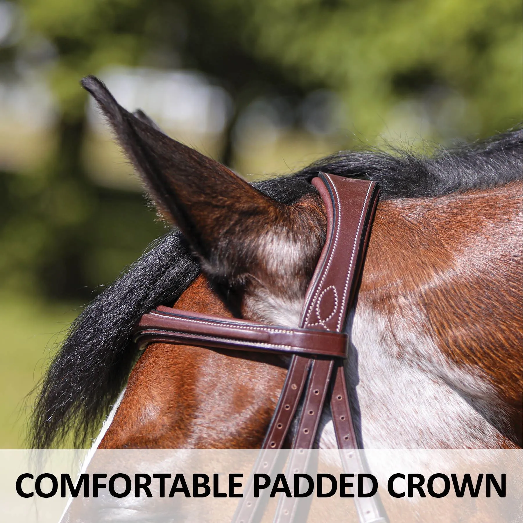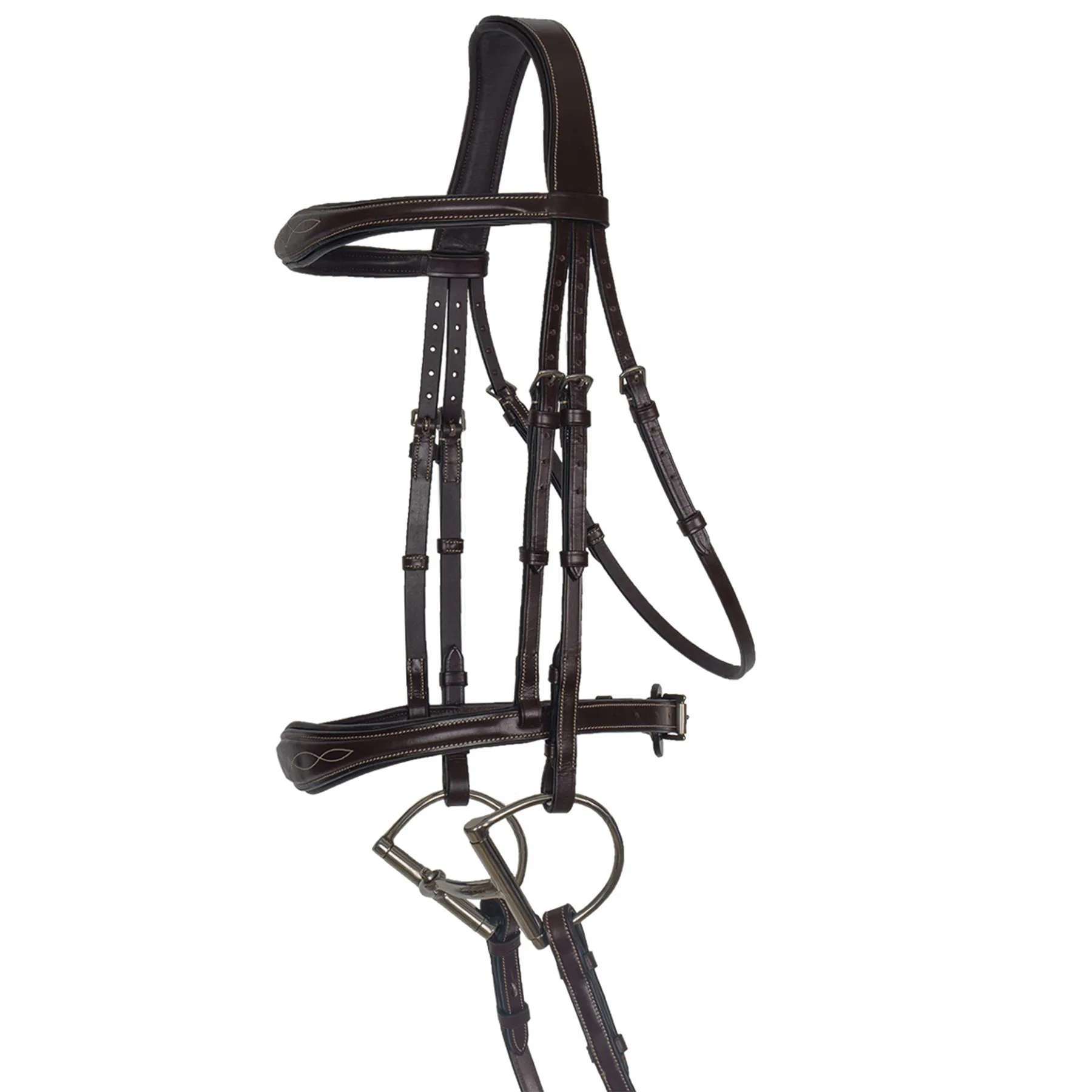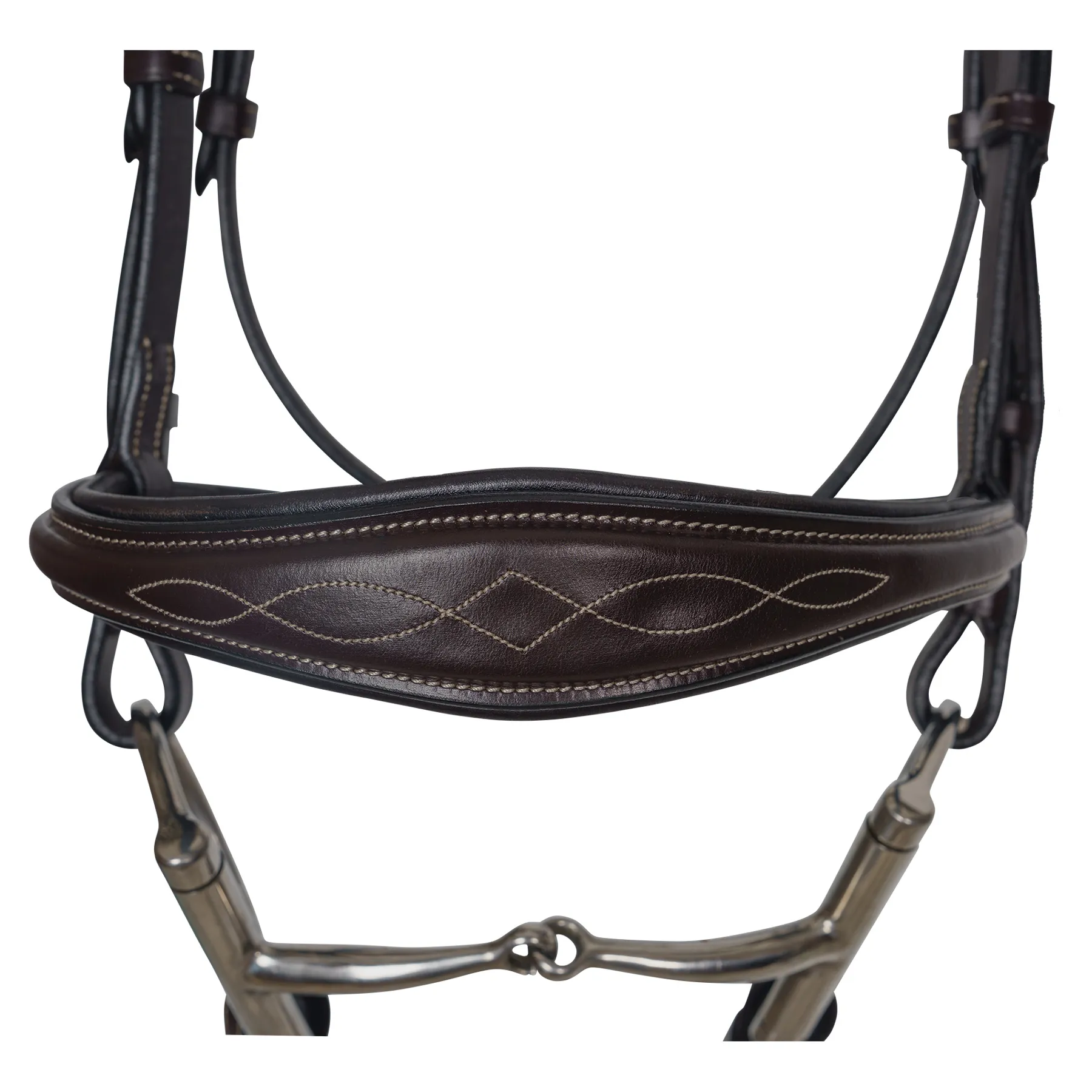Joseph Sterling leather goods are crafted from the finest English leather which is hand selected from J & E Sedgwick & Co. LTD. The comfort, quality, and resilience of Joseph Sterling tack will exceed your expectations. Featuring 15 stitches per inch, hand rubbed beveled edges, and stainless hardware, all Joseph Sterling products are designed to last. Fancing stitching on the browband and noseband, includes 5/8″ x 54″ matching laced reins that are raised with fancy stitching at the bit end.