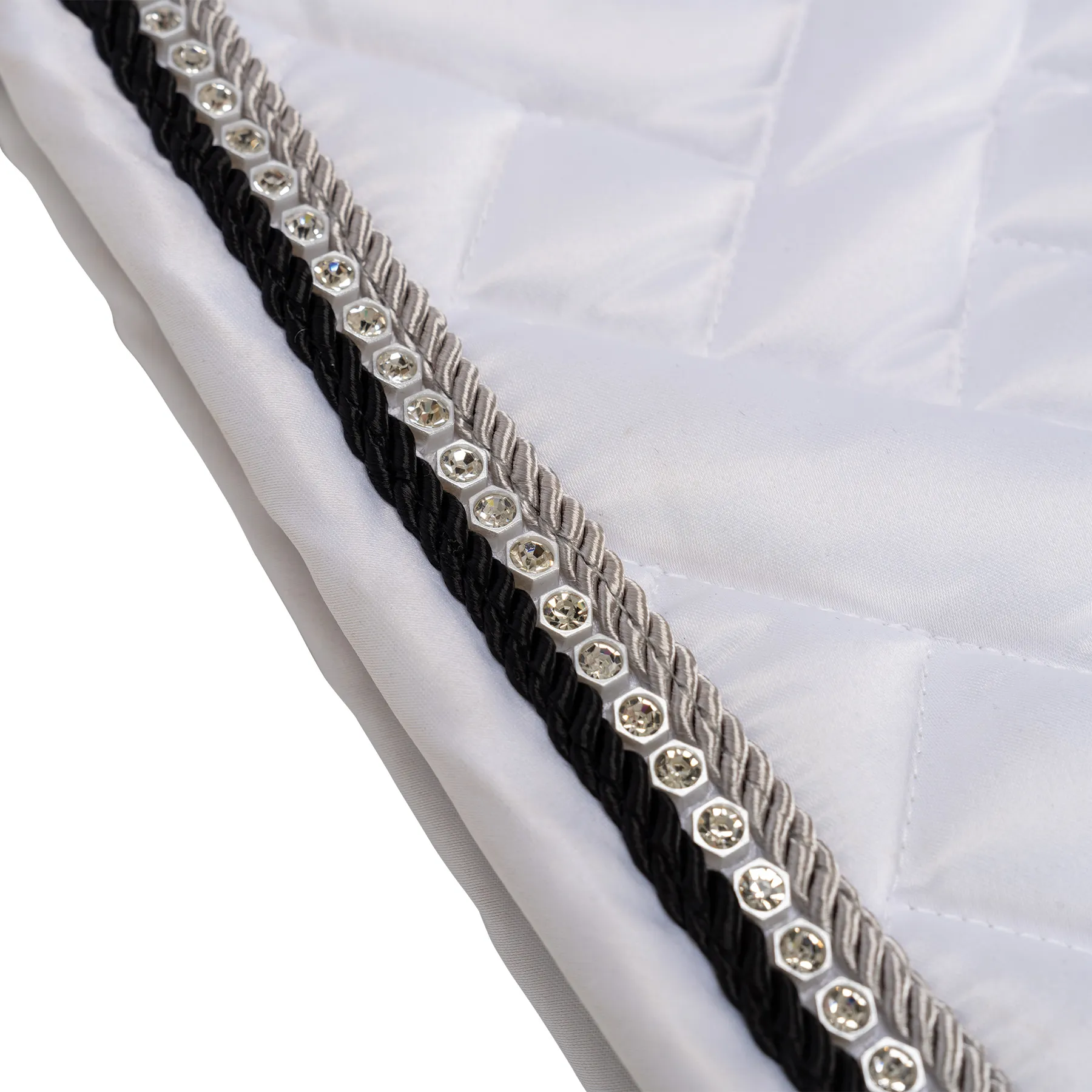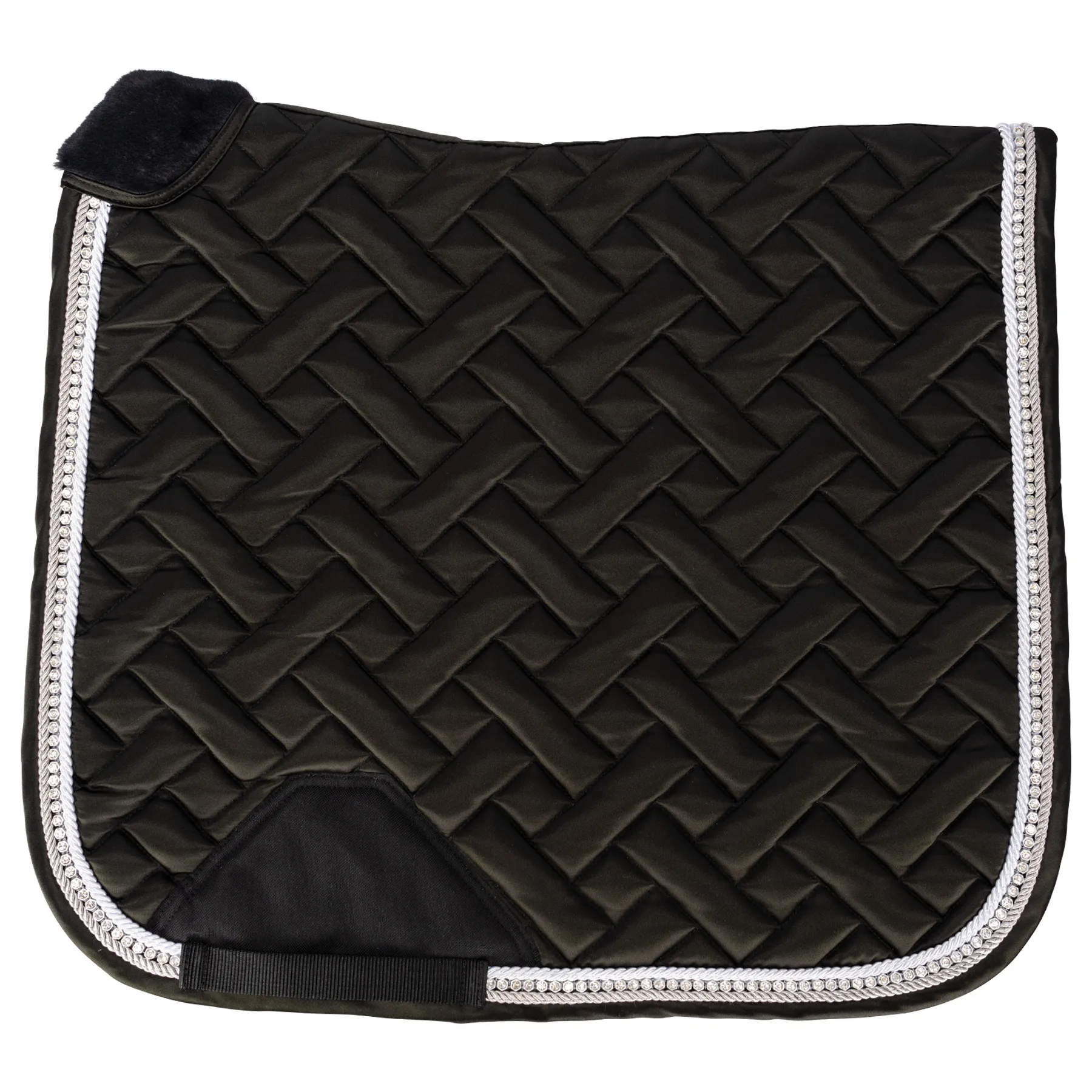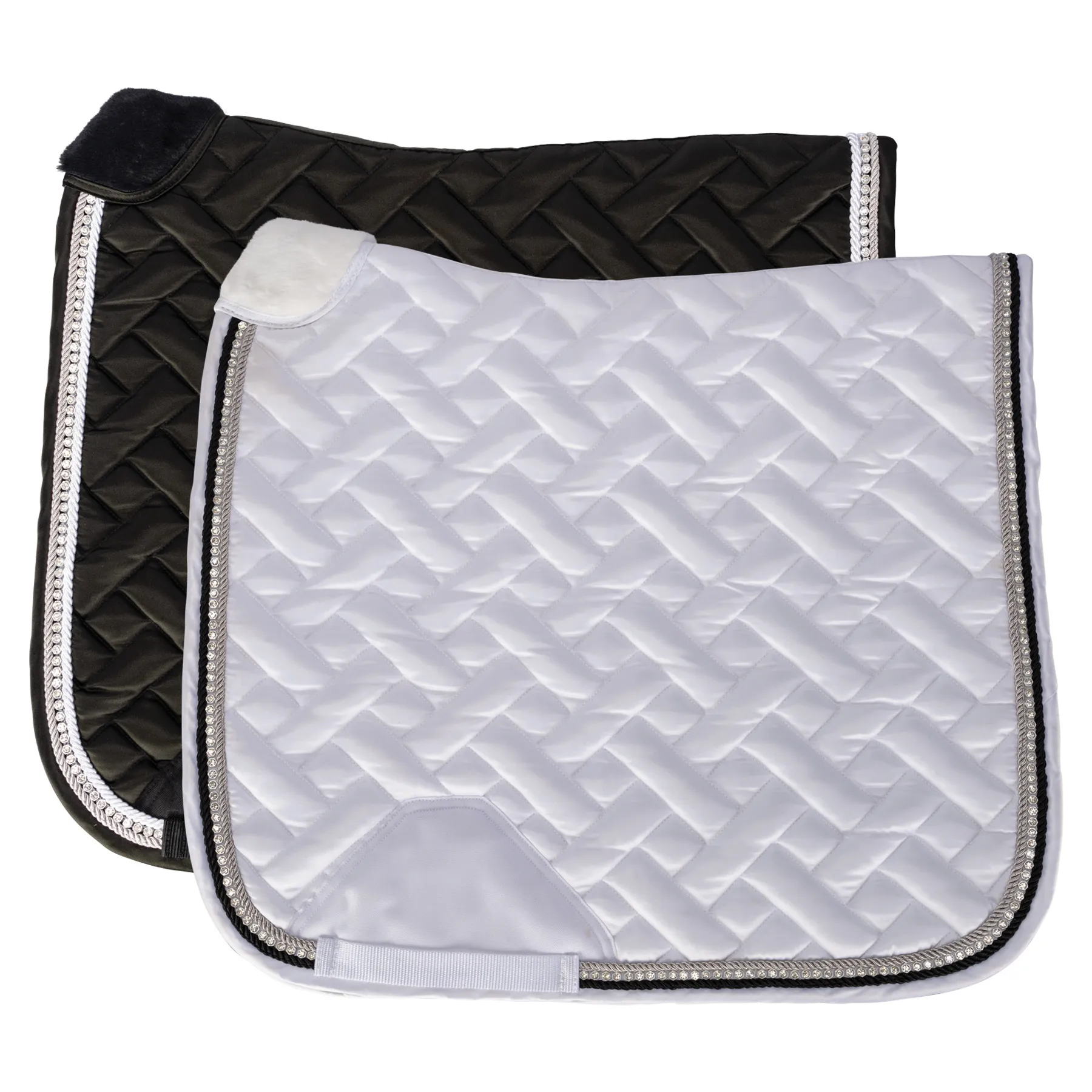 Add a touch of luxury to your dressage gear with the Schneiders® Satin Dressage Pad with Bling. This upscale dressage pad, designed to make your horse stand out in any arena, features a beautiful basketweave print crafted from poly-satin material. The braided trim and rhinestone border adds an extra sparkle that sets this saddle pad apart. Beyond its aesthetic appeal, the contoured wither design and inner foam padding ensure your horse feels comfortable while looking their best. The pad also allows for air circulation and has 1″ nylon web girth loops to prevent slipping.