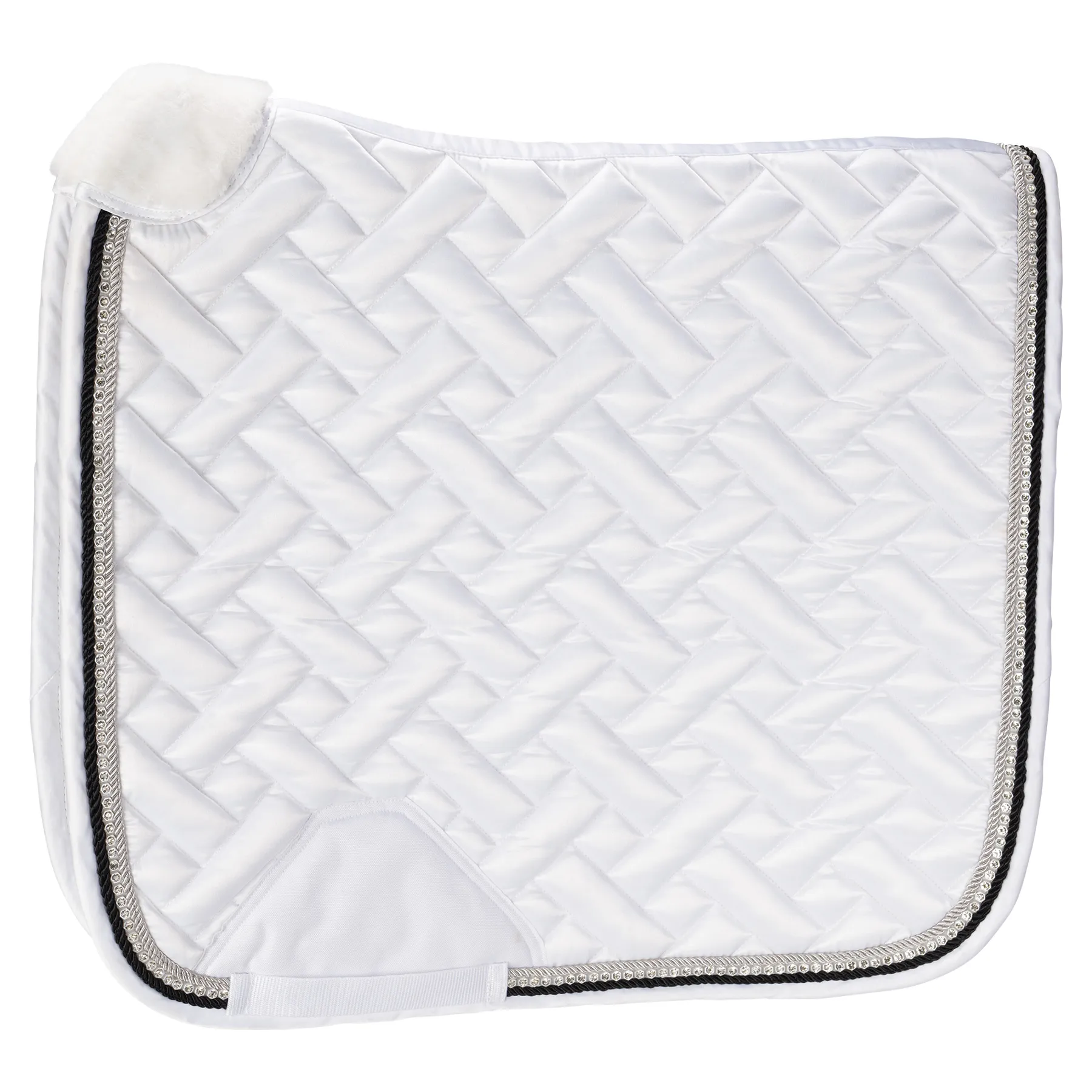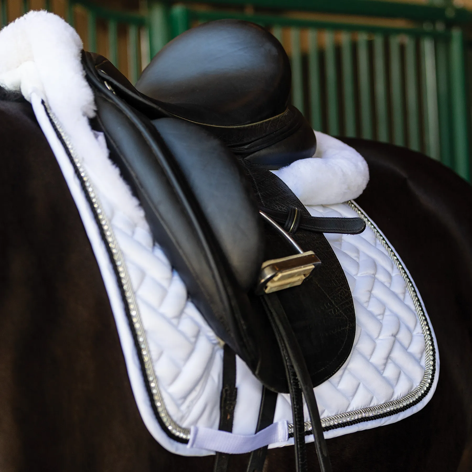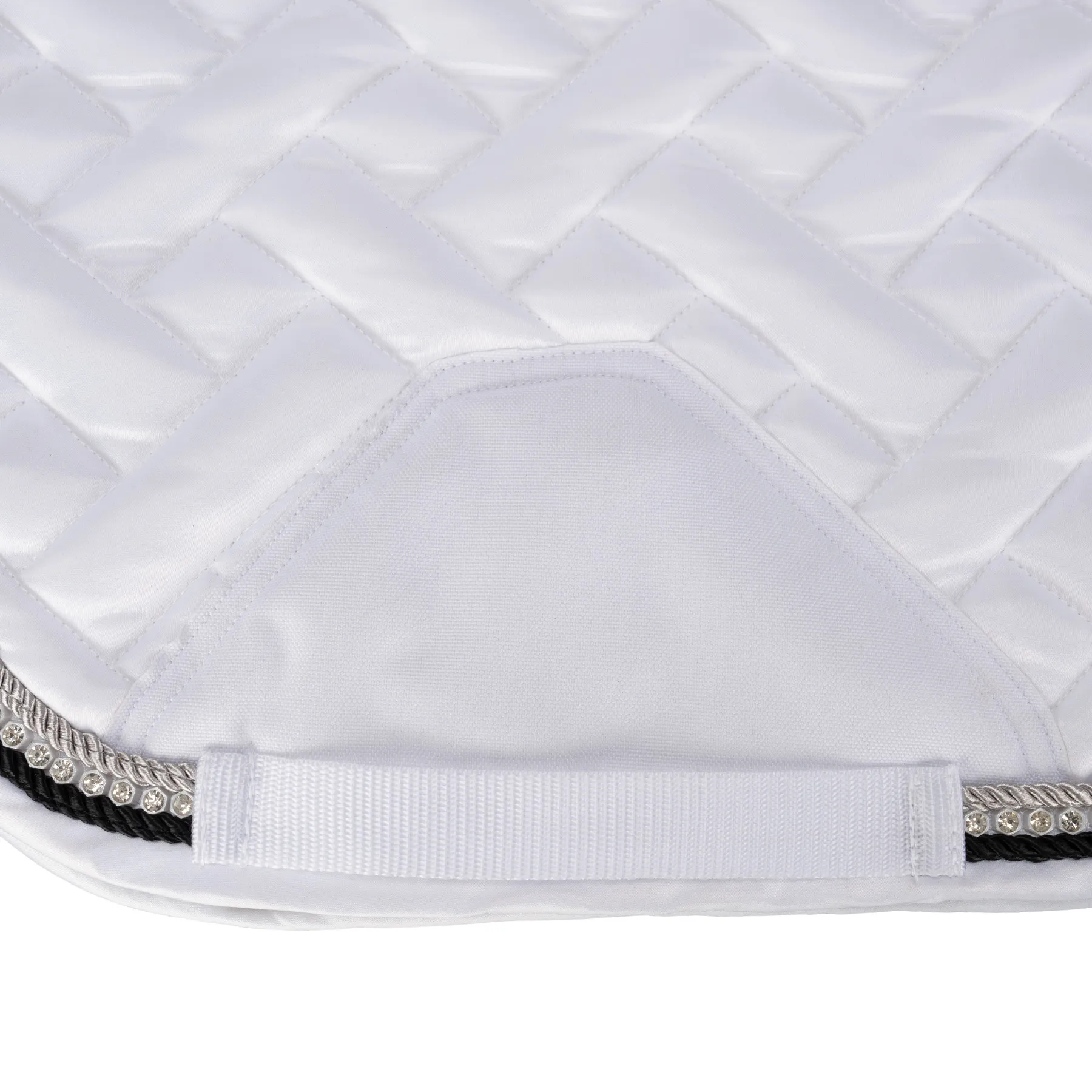 Add a touch of luxury to your dressage gear with the Schneiders® Satin Dressage Pad with Bling. This upscale dressage pad, designed to make your horse stand out in any arena, features a beautiful basketweave print crafted from poly-satin material. The braided trim and rhinestone border adds an extra sparkle that sets this saddle pad apart. Beyond its aesthetic appeal, the contoured wither design and inner foam padding ensure your horse feels comfortable while looking their best. The pad also allows for air circulation and has 1″ nylon web girth loops to prevent slipping.